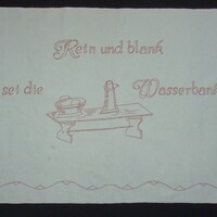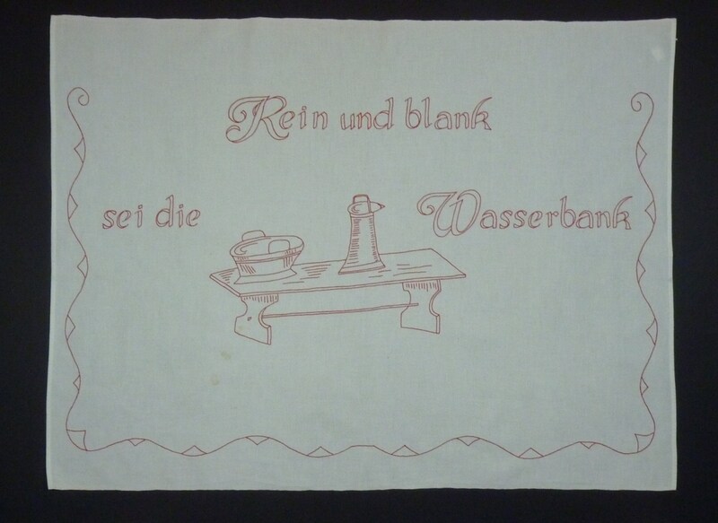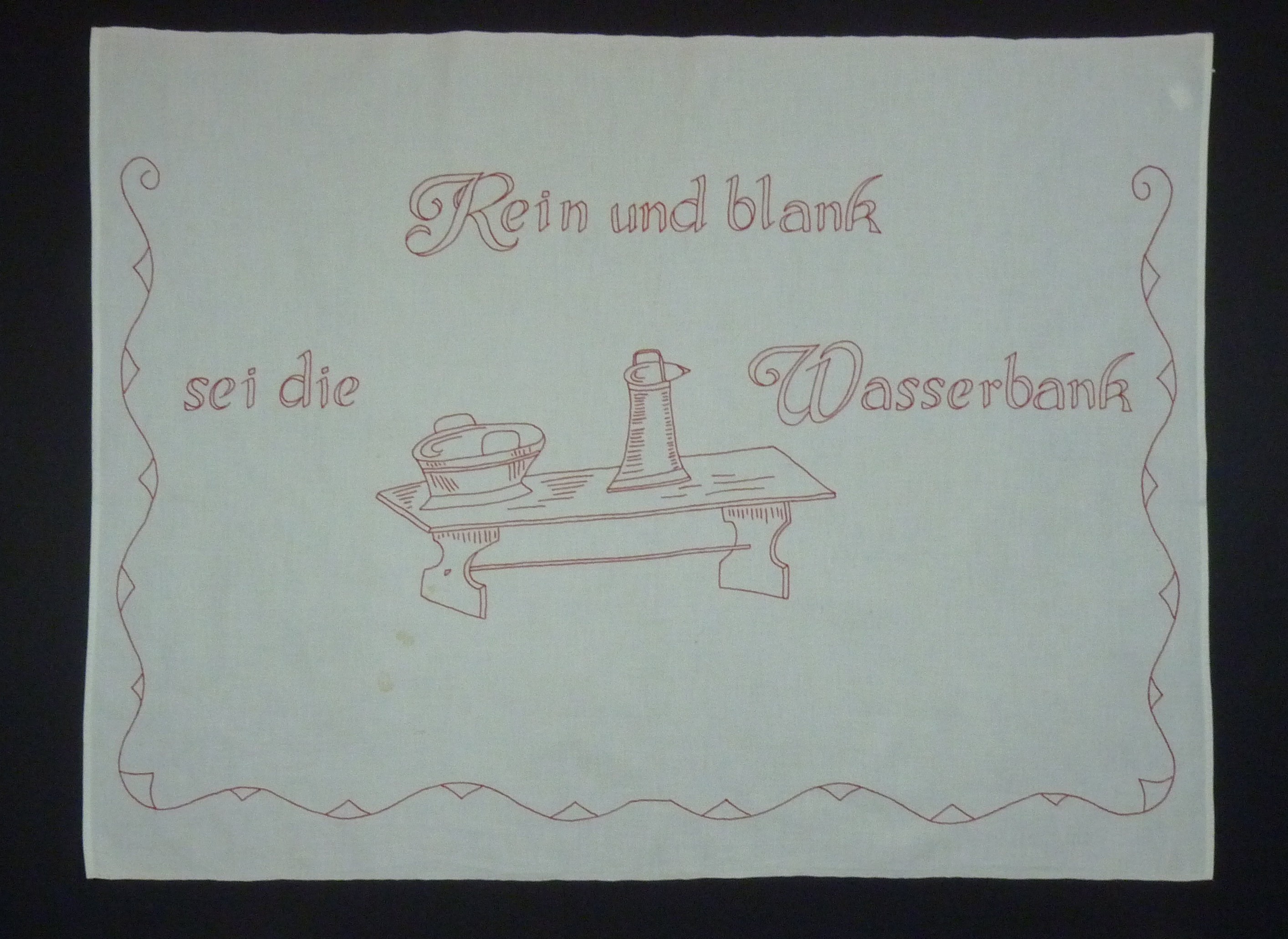 rot bestickt; Motiv: Bank mit Schüssel und Krug;