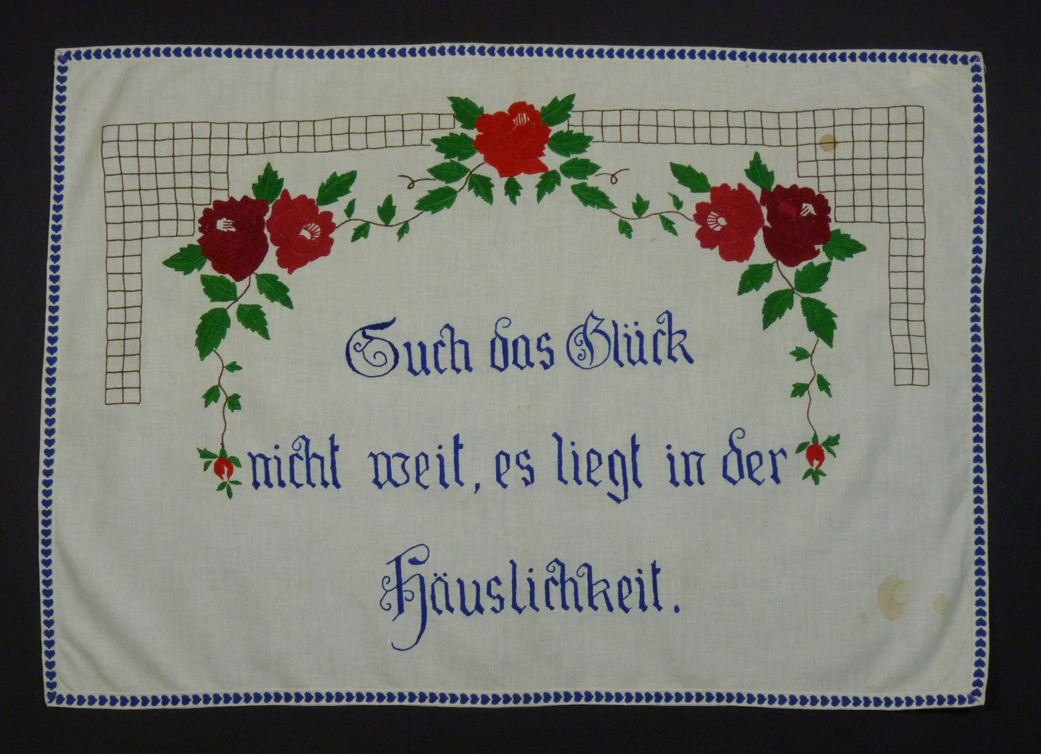 Spruch blau gestickt; Blumenranken rot und grün; mit blauem Herz-Zierband eingefasst;