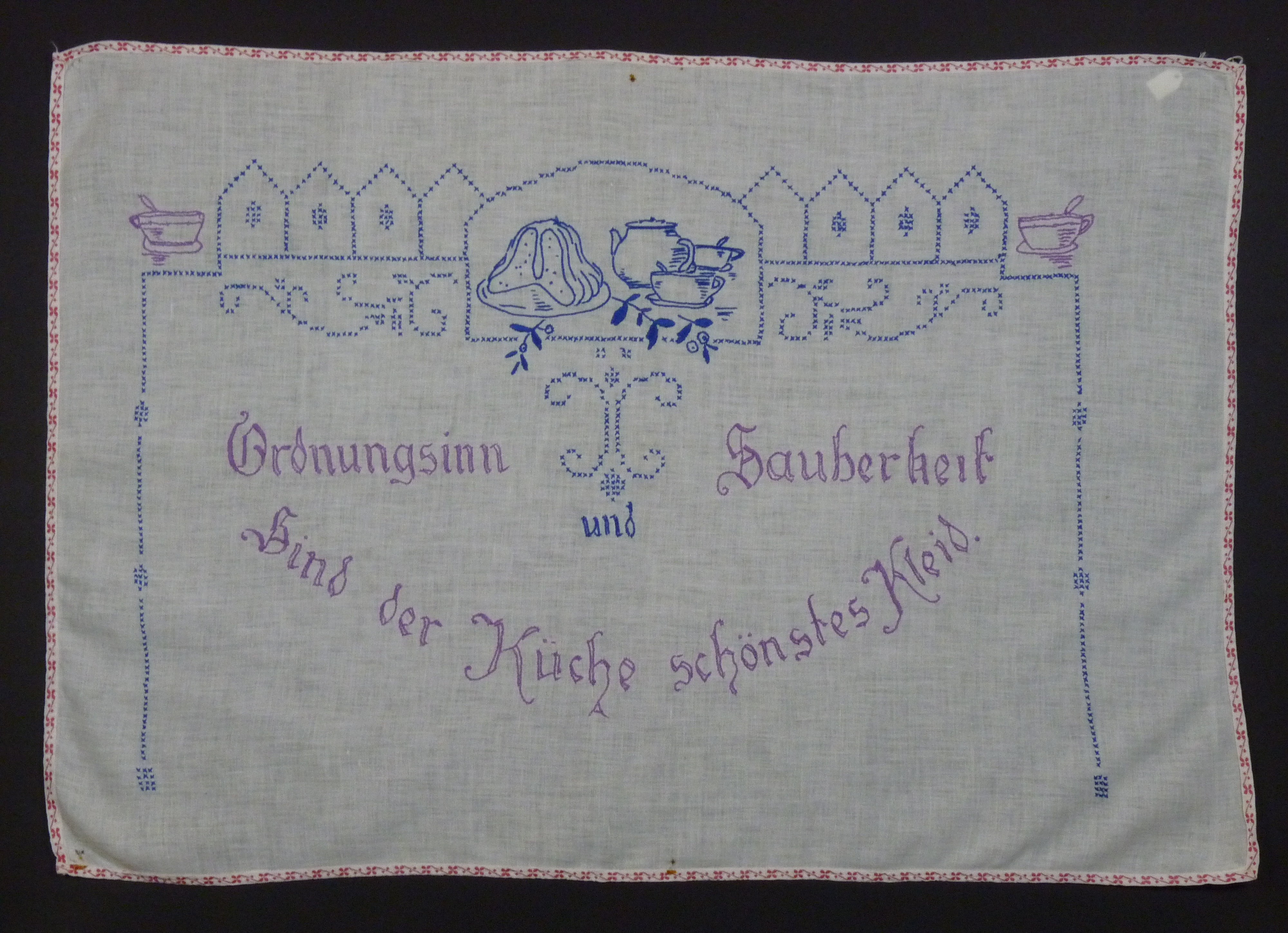 blau und violett bestickt; Kreuz- und Stielstich; mit rot-weißem Textilband umrandet; Motiv: Gugelhupf mit Kaffeekanne und Tassen;