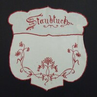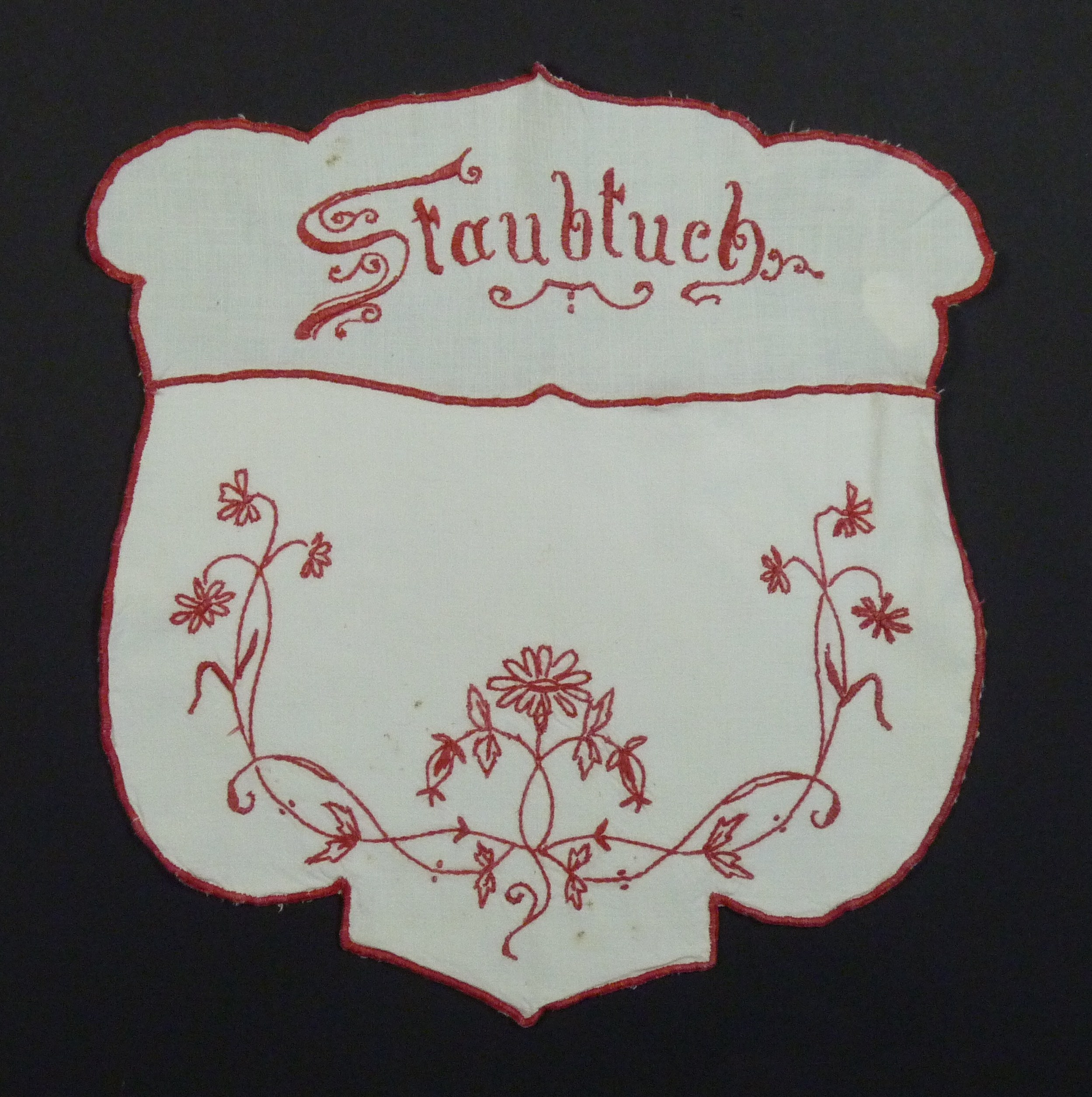 rot bestickt; mit Tasche; am Rand eingefasst; Blumenornamente;