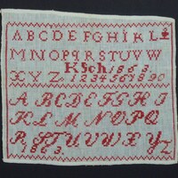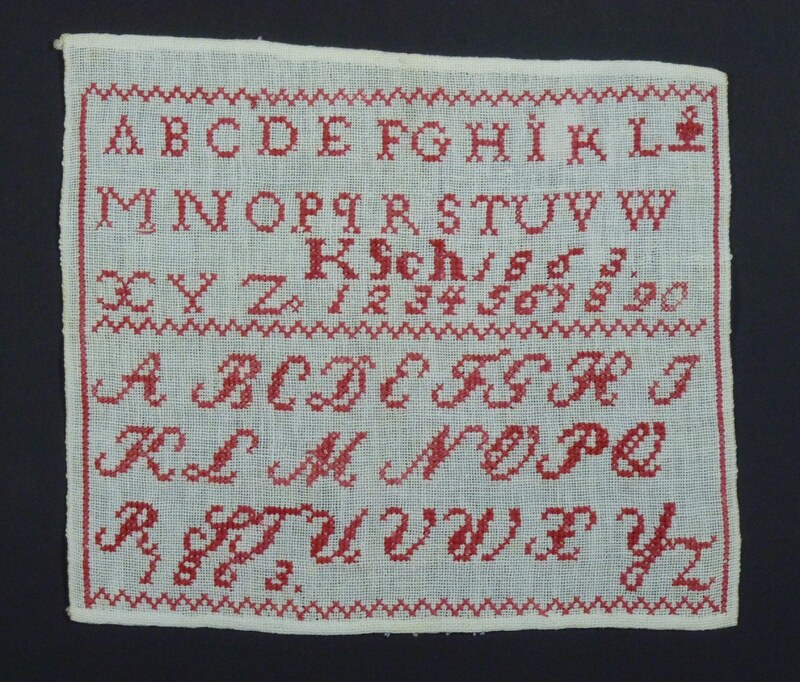 - rot bestickt; Kreuzstich; Motiv: Alphabet in zwei verschiedenen Schriften, Initalien 1863