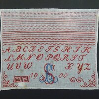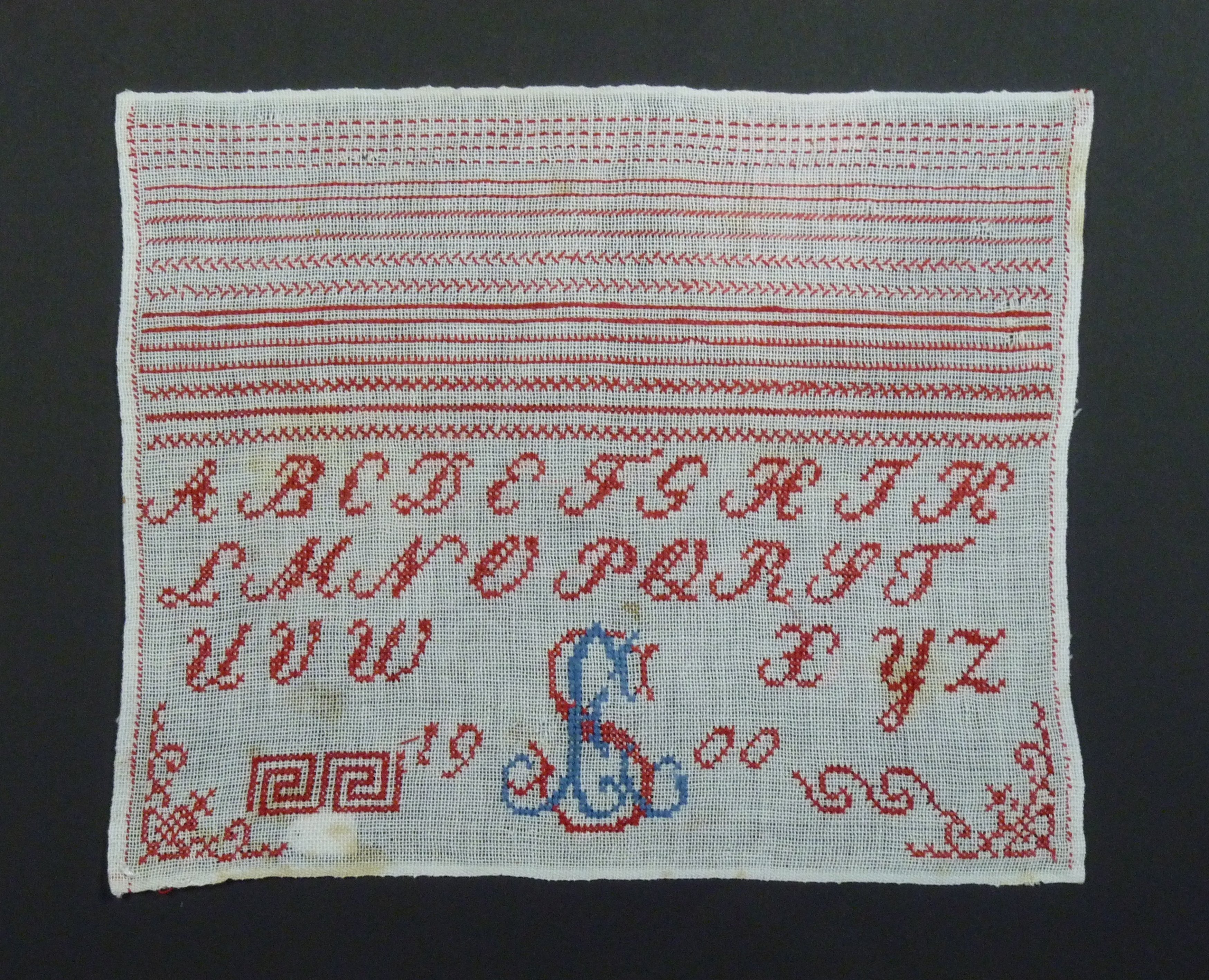 - rot bestickt; Kreuzstich; Motiv: Buchstaben, Stichproben, Initalien und ev. Jahreszahl