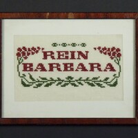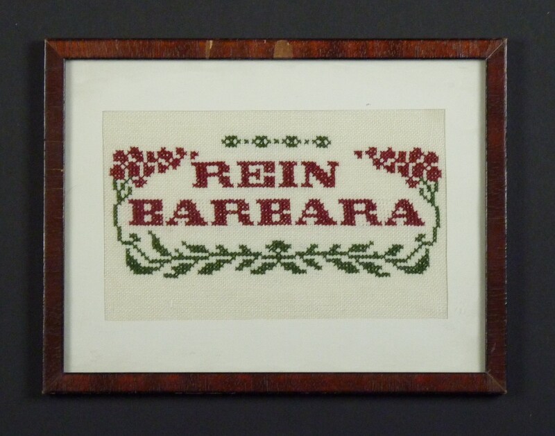 - gerahmtes Bild mit gesticktem Namen: "Rein Barbara"; Kreuzstich, rotes und grünes Garn; Blumenornamente;
