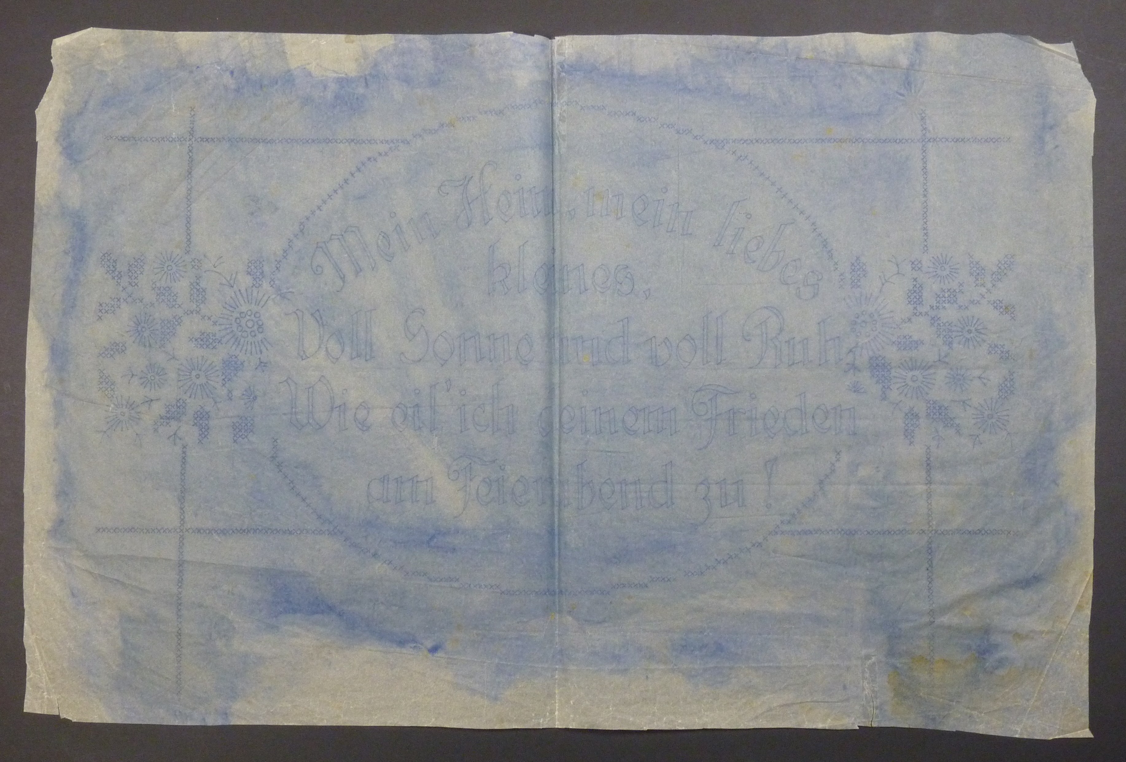 Spruch: "Mein Heim, mein liebes / kleines, / Voll Sonne und voll Ruh / Wie eil' ich deinem Frieden / am Feierabend zu!"