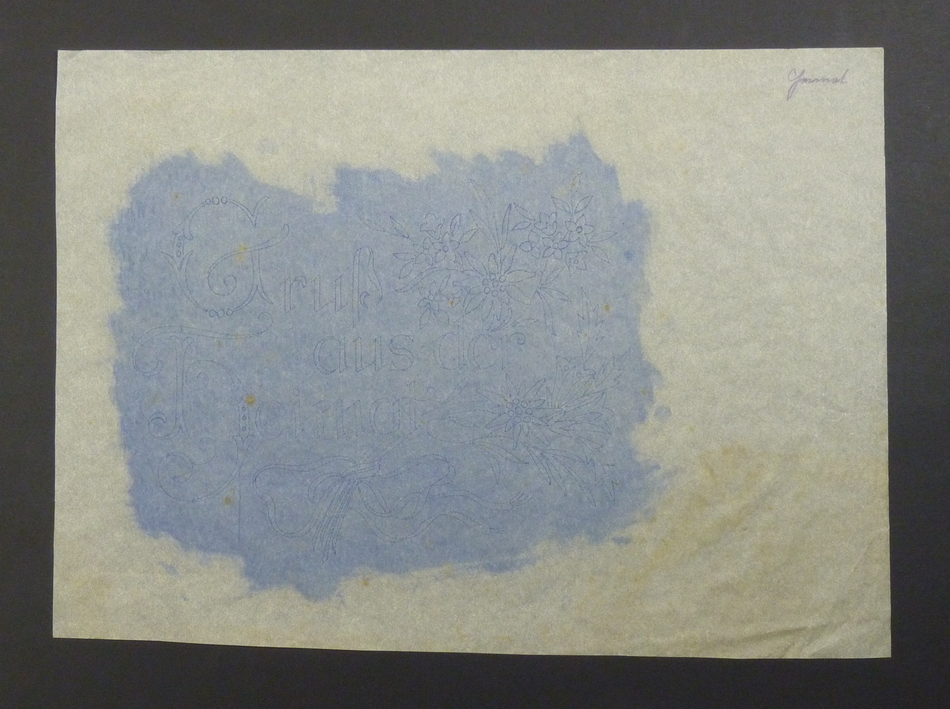 Schablone; Motiv und Spruch wurden mit Nadeln durchgestochen; Motiv: Blumenranken;