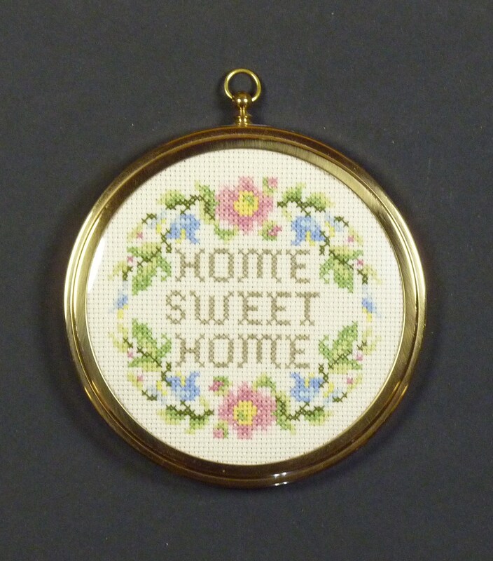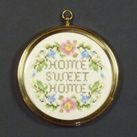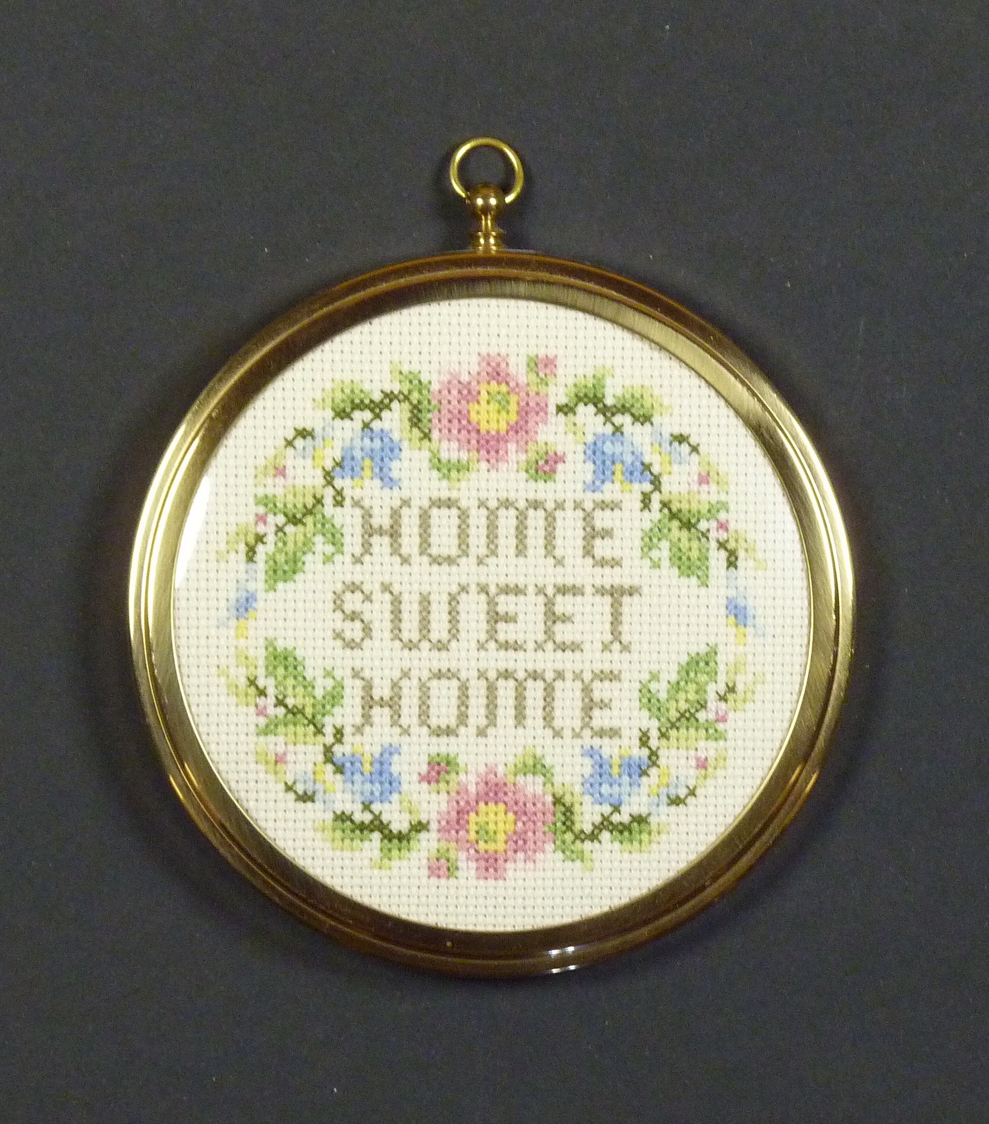 in Goldrahmen; Blumenmotiv; bunt bestickt;