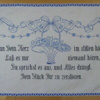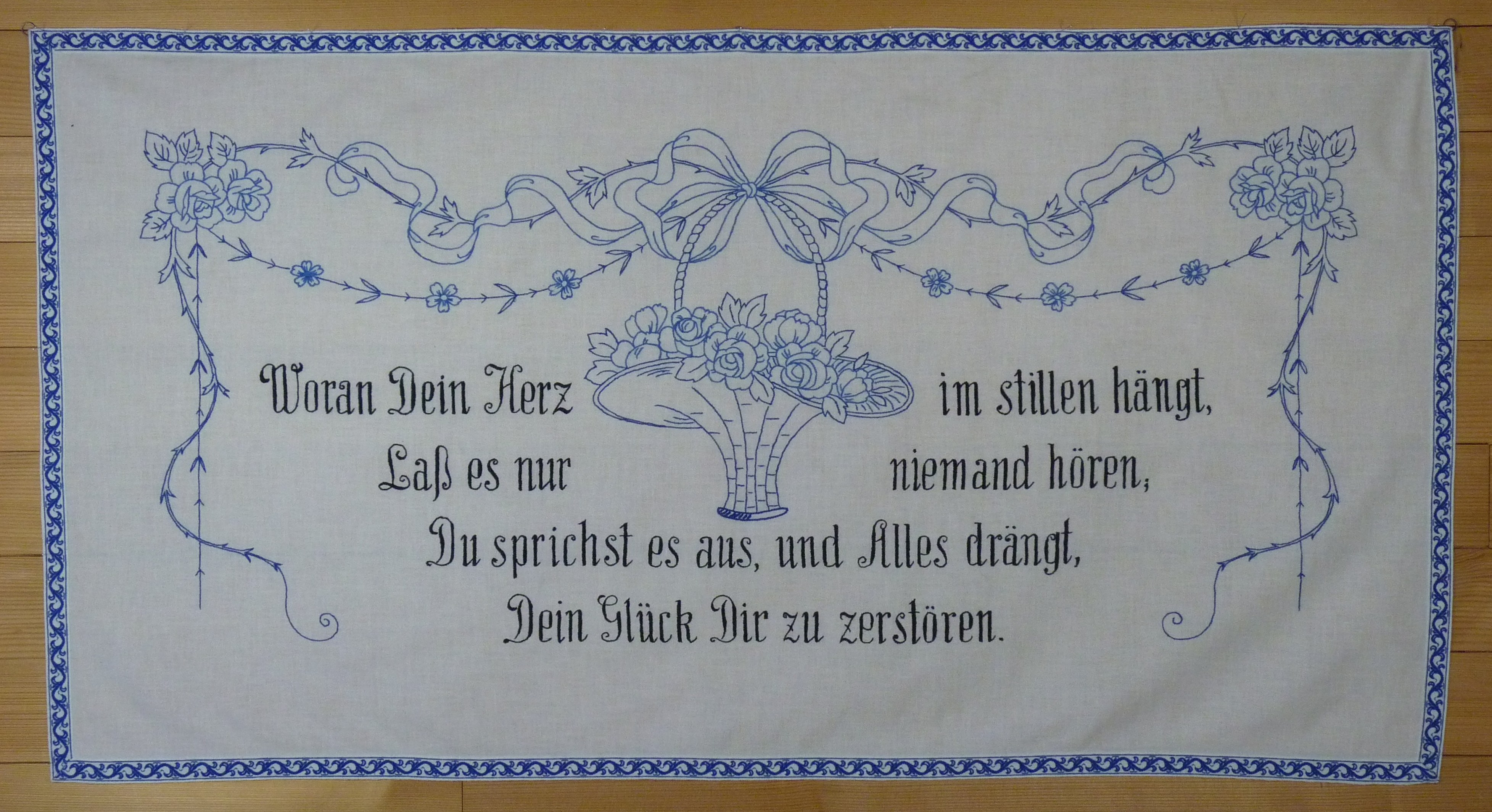 Plattstich; mit Blumenkorb und großer Schleife; in blau und schwarz bestickt; mit blau- weißemTextilband eingefasst; drei Metallringe als Aufhängung;