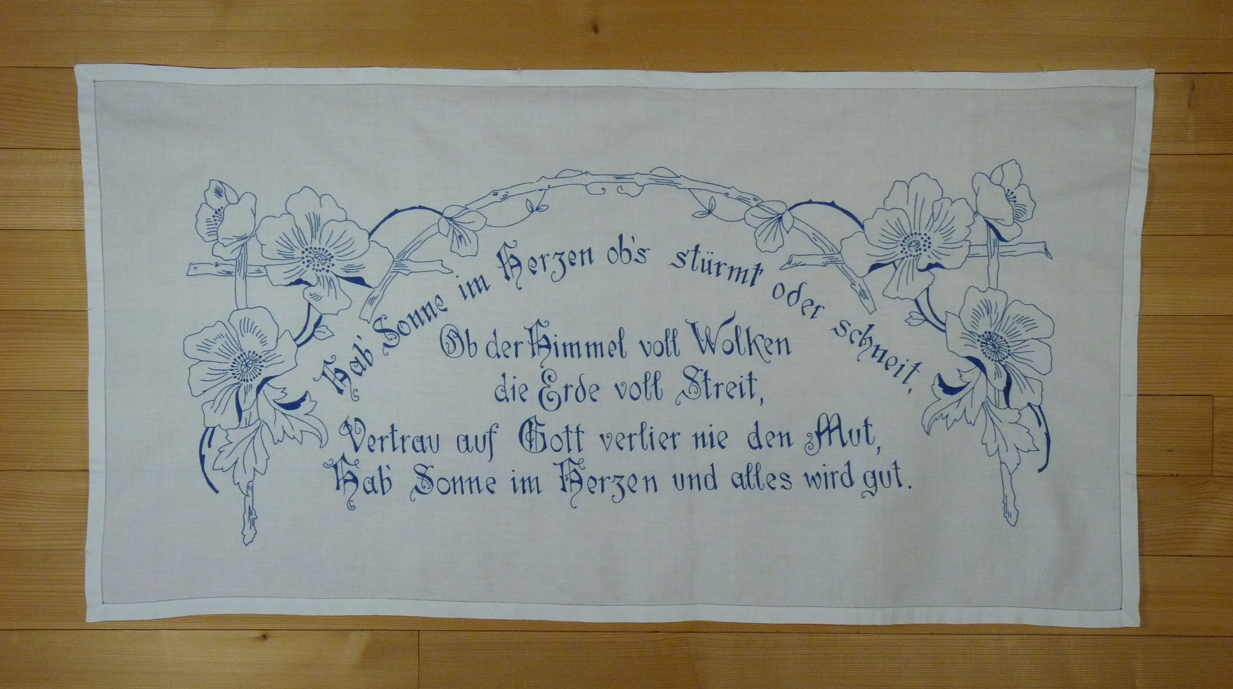 Spruch: "Hab' Sonne im Herzen ob's stürmt oder schneit, Ob der Himmel voll Wolken / die Erde voll Streit, / Vertrau auf Gott verlier nie den Mut, / Hab' Sonne im Herzen und alles wird gut." - Umfang