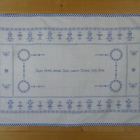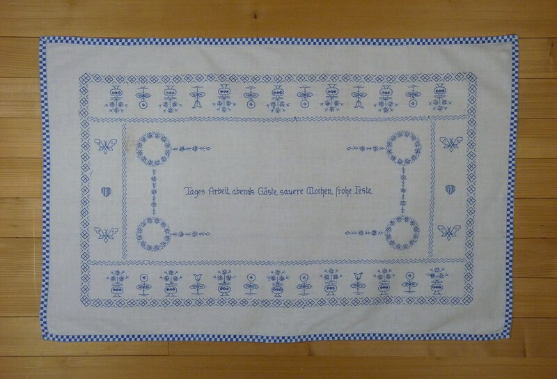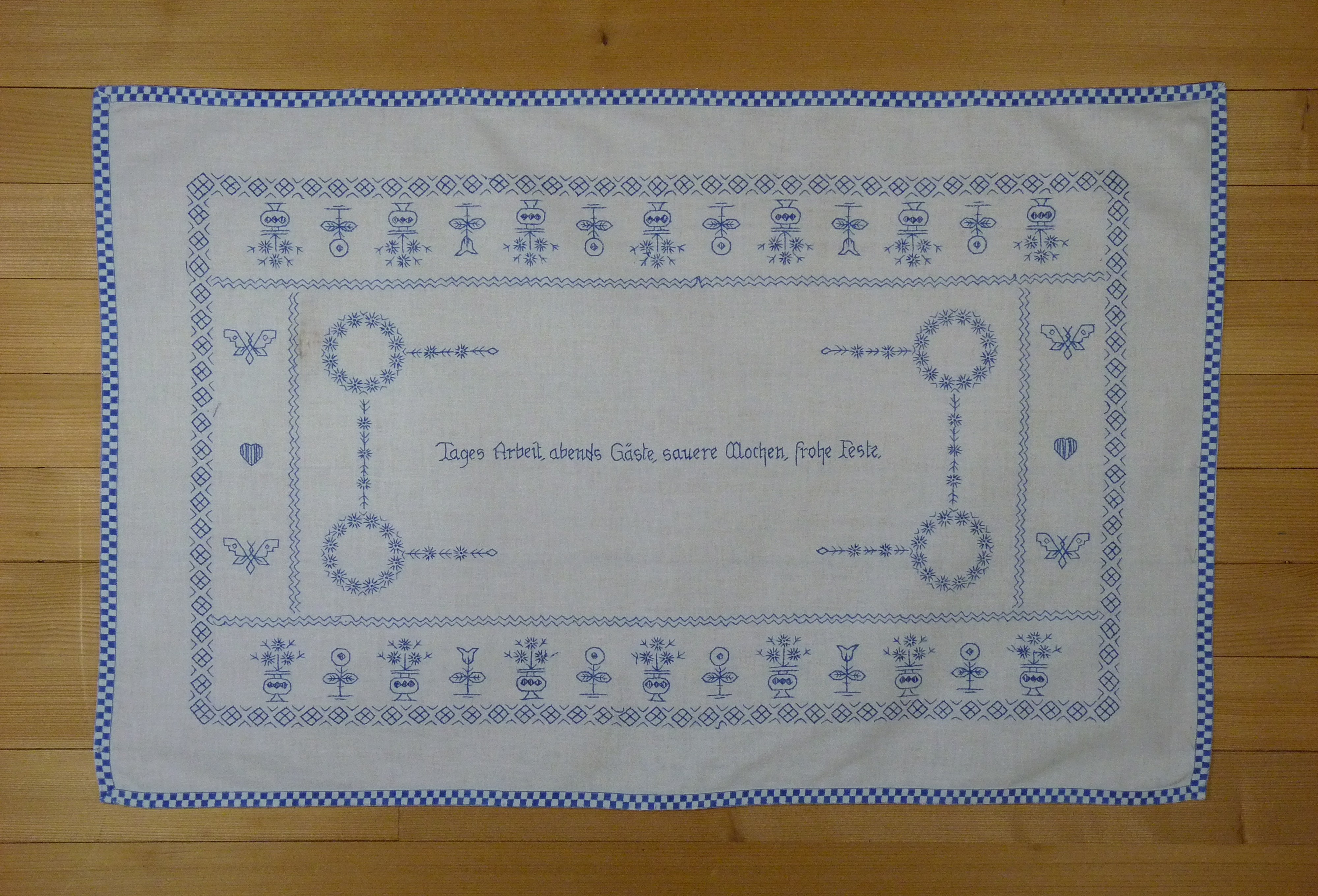 blau bestickt; mit blauem Zierband eingefasst; Blumenornamente;