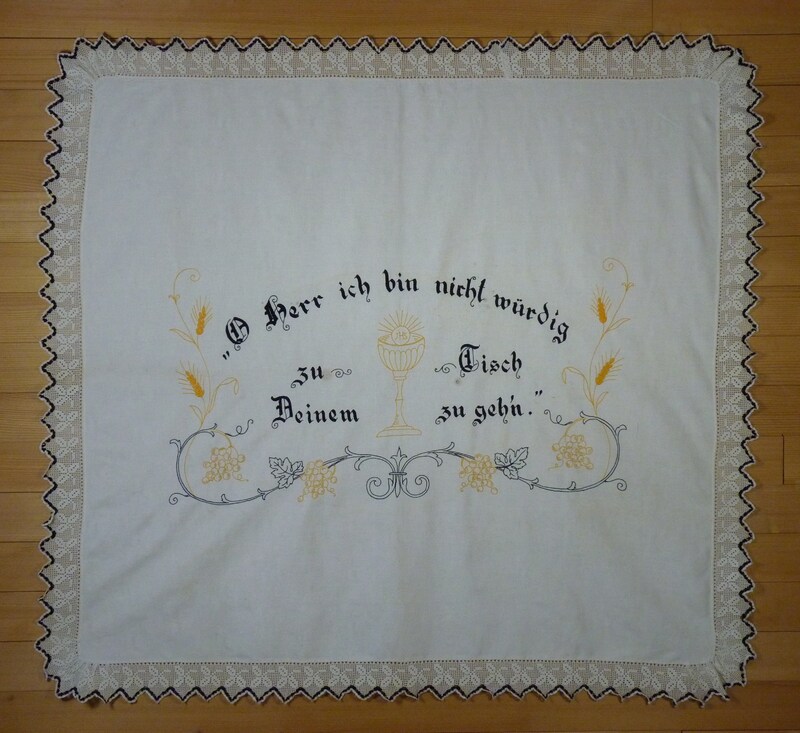 Motiv: Kelch mit Hostie, IHS, Trauben- und Ährengirlande; schwarz, gelb bestickter Baumwollstoff (gewebtes Blumenmuster); mit Häkelspitze (weiß-schwarz) umrandet;