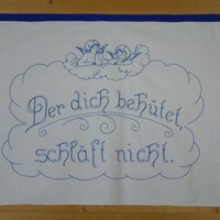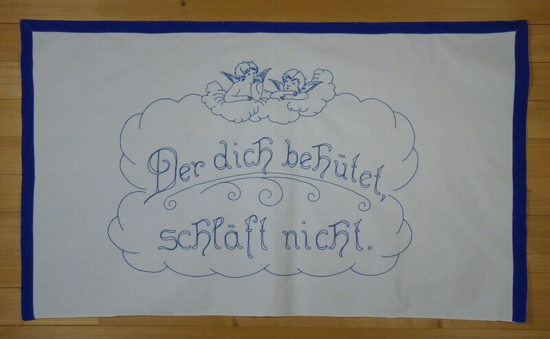 blaue Stickerei; an drei Seiten mit blauem Stoffband eingefasst; Motiv: zwei Engel nachdenkend in Wolke;