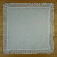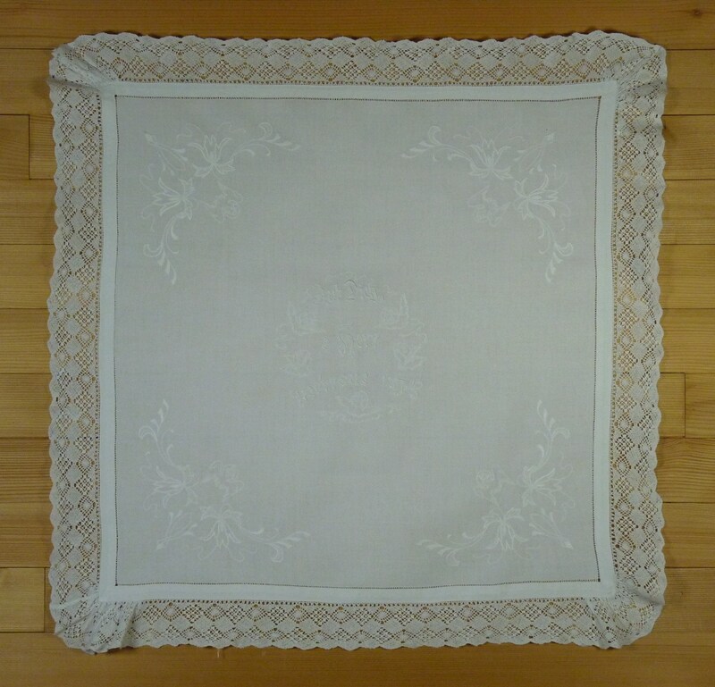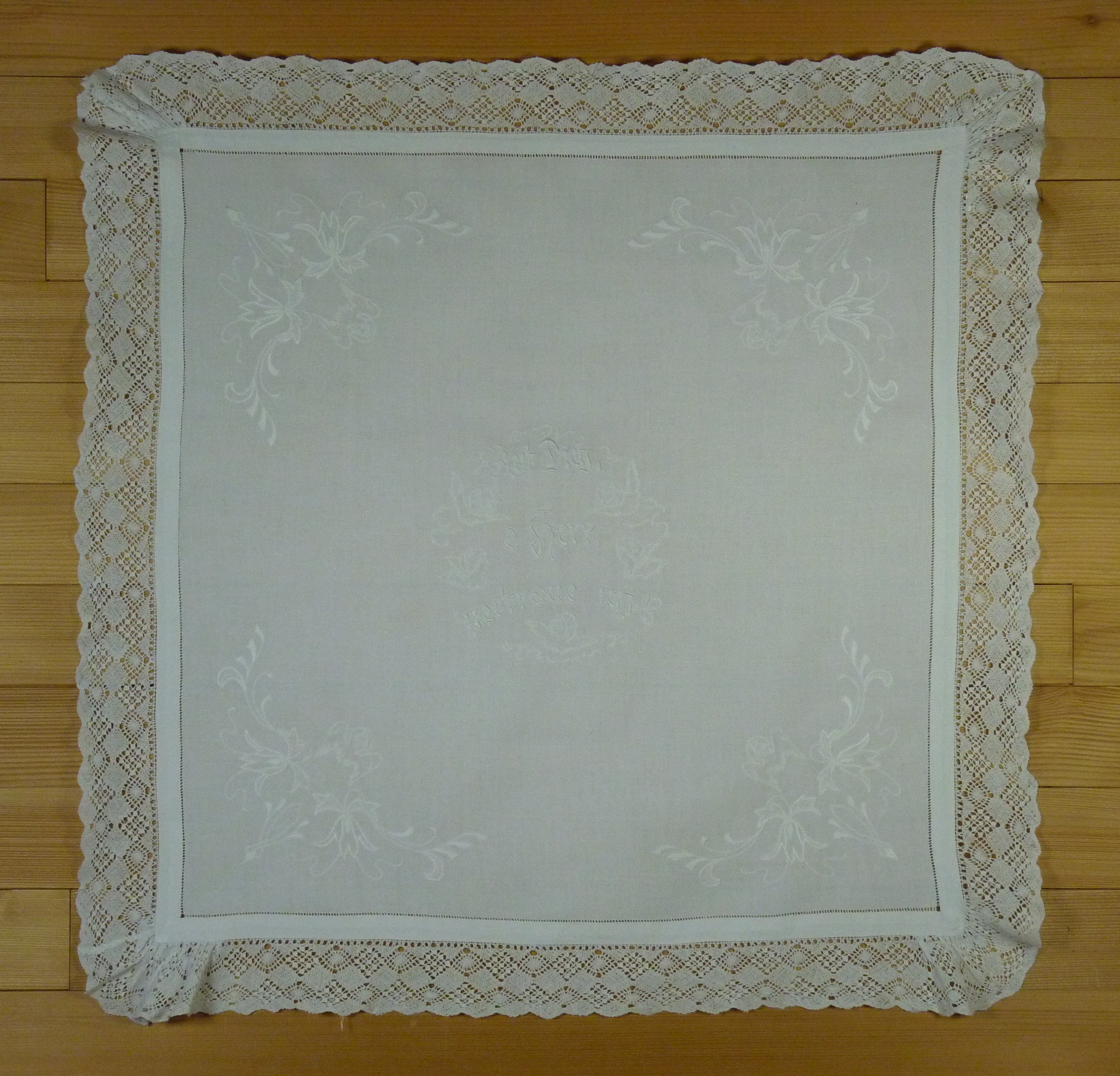 mit 7 cm breiten Spitzen eingefasst; Hohlsaum; mit weißem Garn bestickt; Motive: Engel, Blütenranken;