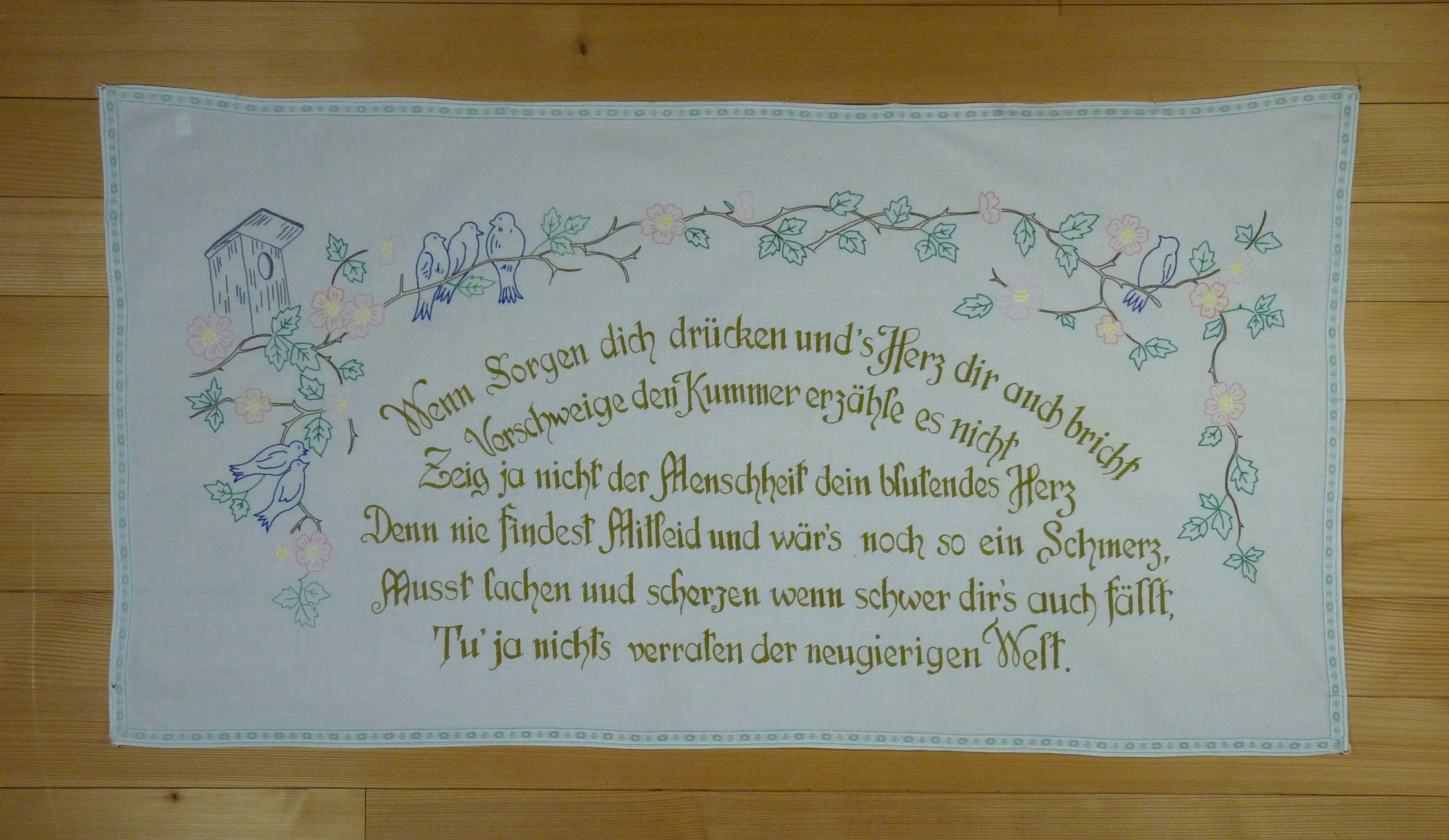 Spruch: "Wenn Sorgen dich drücken und's Herz dir auch bricht / Verschweige den Kummer erzähle es nicht / Zeig ja nicht der Menschheit dein blutendes Herz / Denn nie findest Mitleid und wär's noch so ein Schmerz, / Musst lachen und scherzen wenn schwer dir's auch fällt, / Tu' ja nicht's verraten der neugierigen Welt."