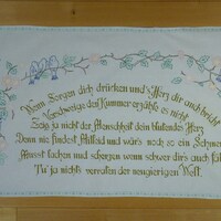 Spruch braun gestickt; Blumen- und Blätterranken, Vögel mit Vogelhaus; mit Zierband eingefasst;