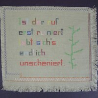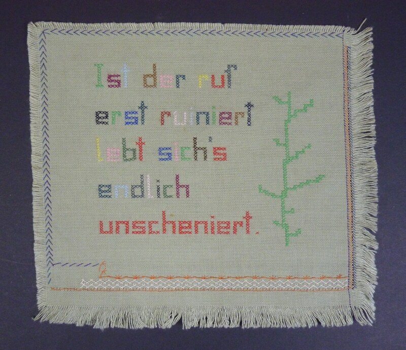 hellgrüner Stoff; Kreuzstich; bunt bestickt; entlang der Ränder Zierstiche;