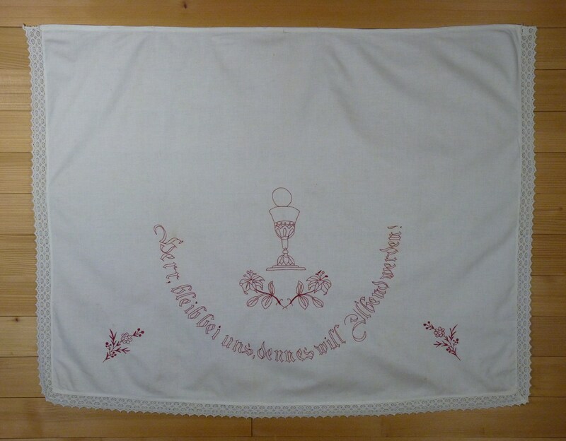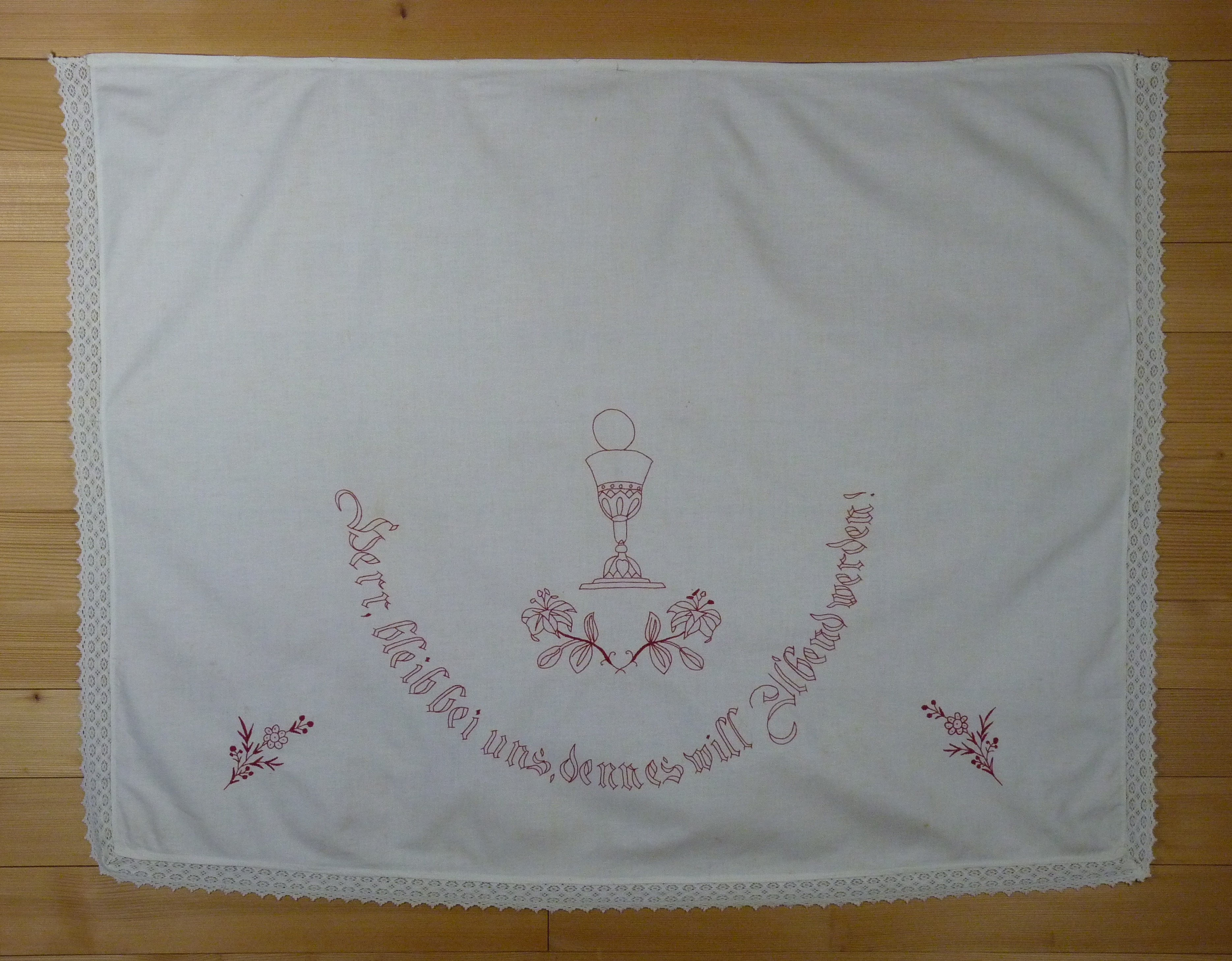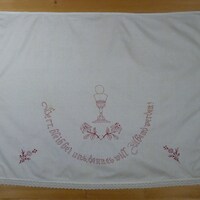 Religiöses Spruchtuch; Kelch mit Hostie; Schwertlilien; Blumenmotive; rot bestickt; links, rechts und unten Spitze;