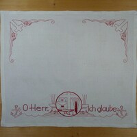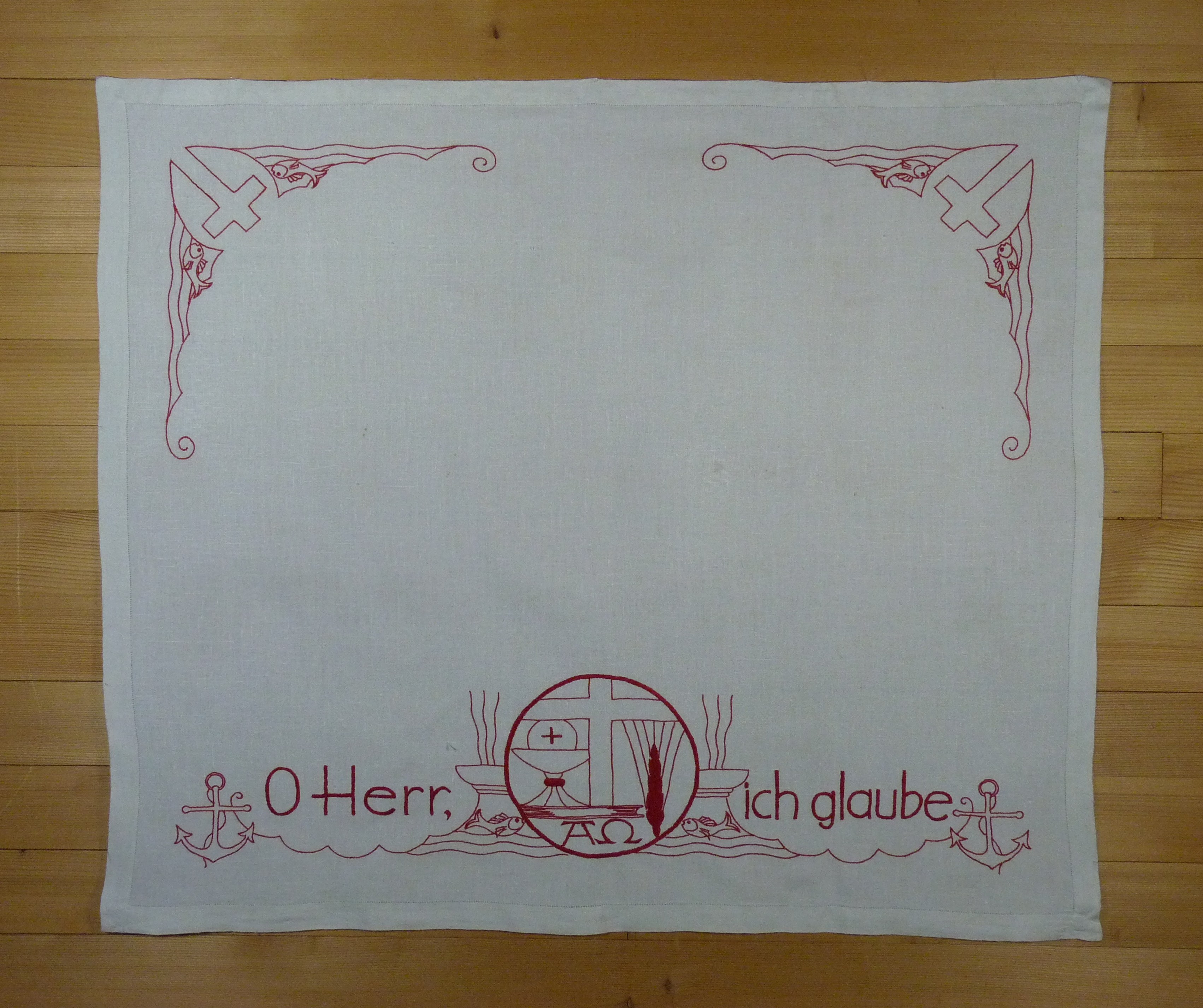 rot bestickt; Motive: Anker, Ähre, Hostie, Alpha und Omega;