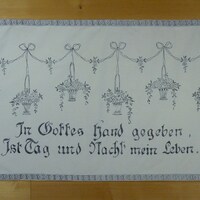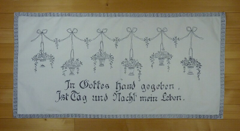 Motiv: Blumenbouquets; Plattstich, Stielstich; mit grauem Zierband eingefasst; oben Haken;
