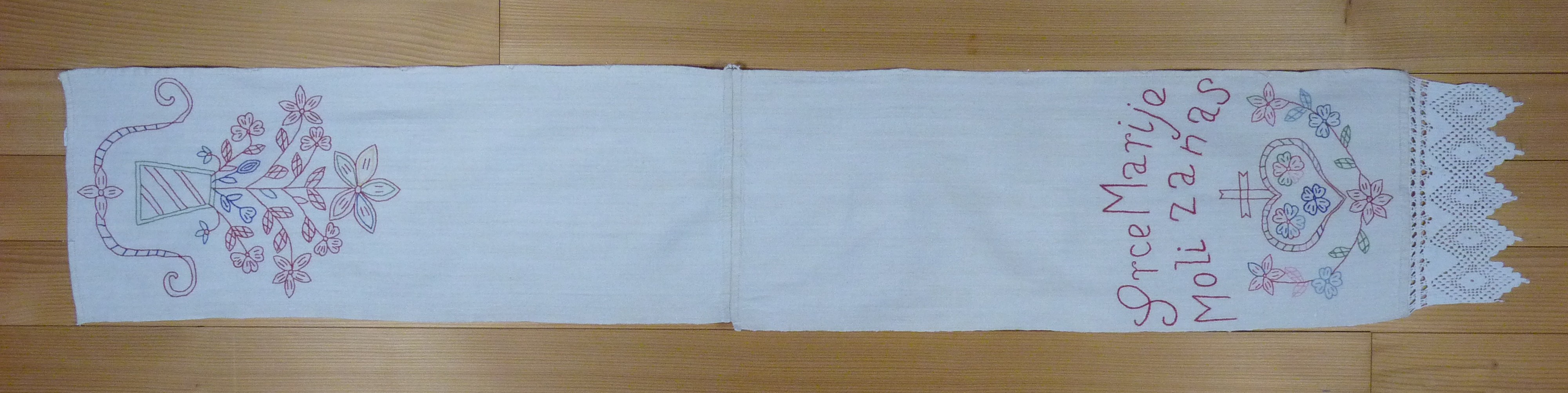 - Kettenstich, Stielstich; rot, blau, grün bestickt; Abschluss mit Spitzen; grobes Tuch; Motiv: Blumenranken, Herz mit Kreuz; Spruch: "Scre Marije / Moli za nas" (wahrscheinlich slowenisch, evtl. nicht richtig wiedergegeben - "Srce Marijino, moli za nas" - ... Maria, bitte für uns?)