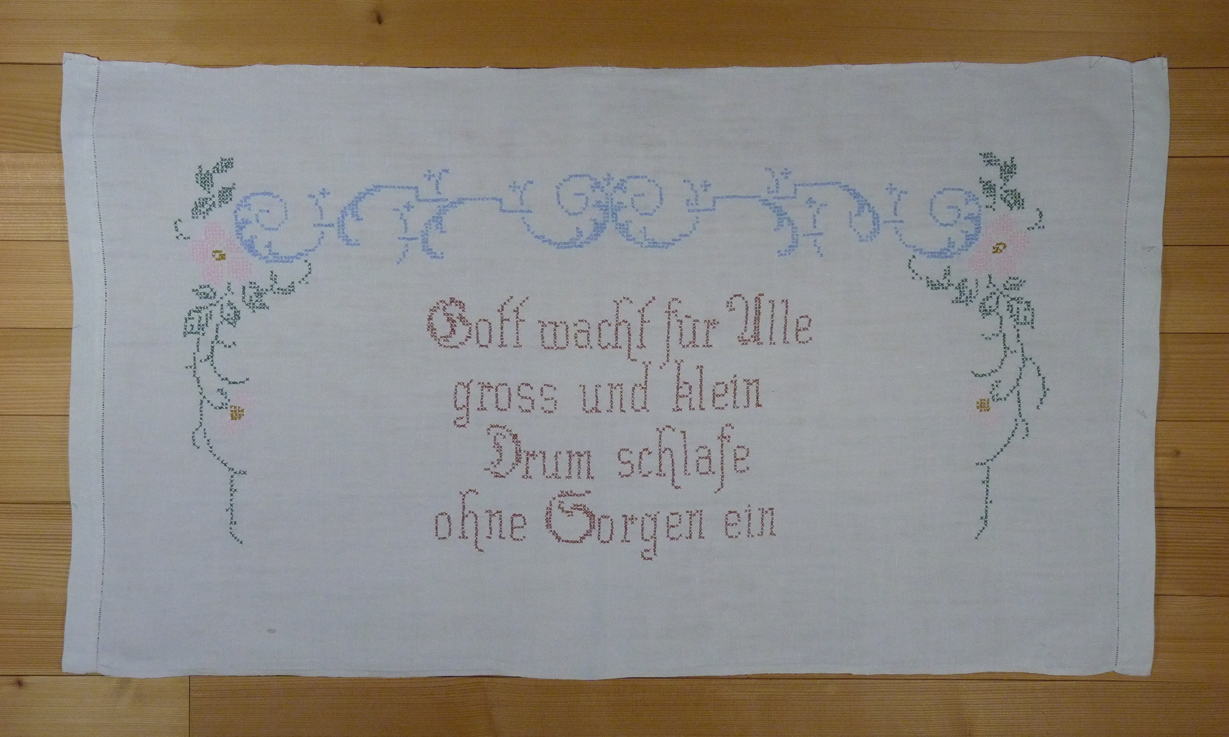 in grün, rosa, braun, hellblau besticktes Leinen; links und rechts Hohlsaum; Kreuzstich;