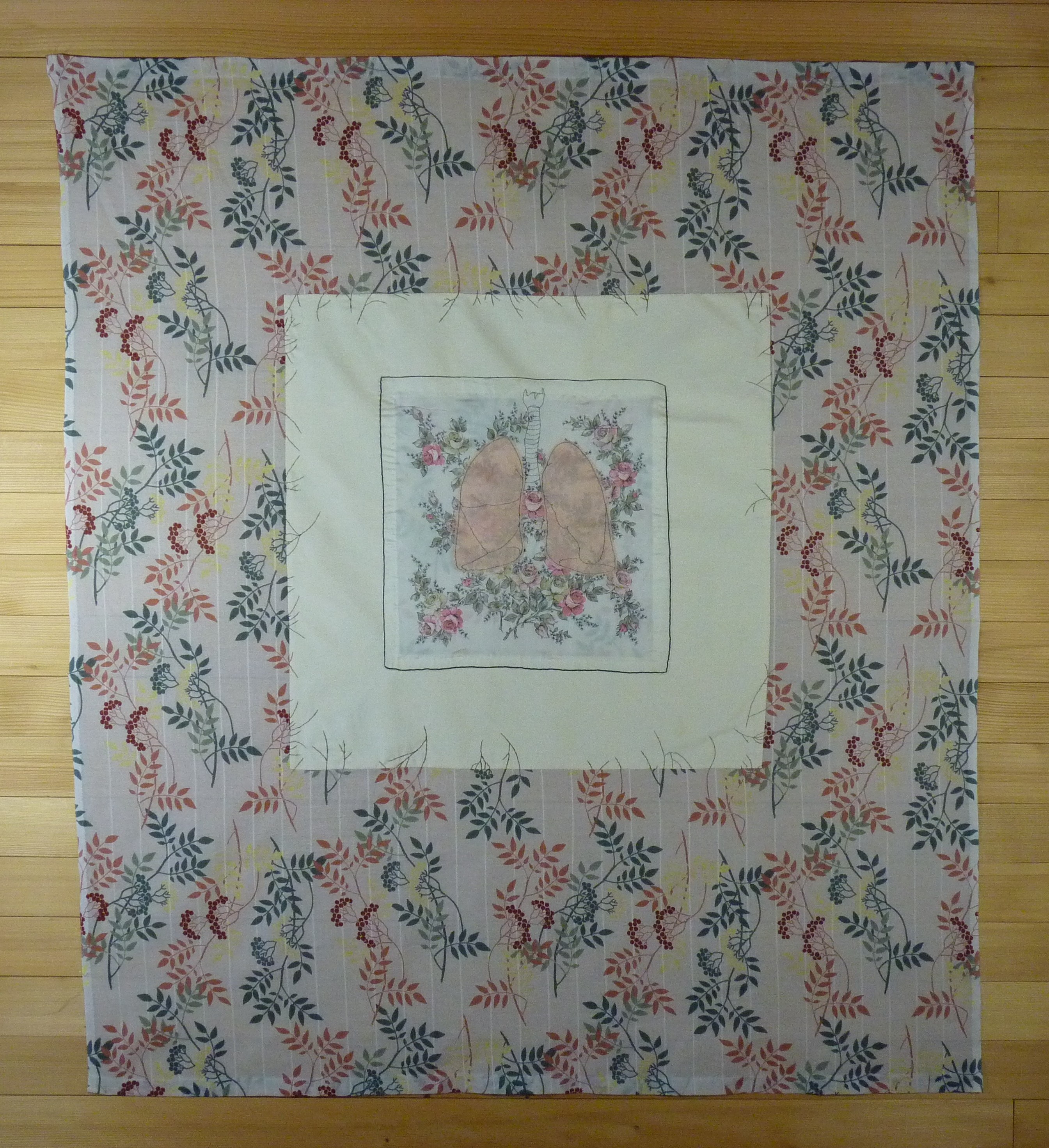 verschiedene Stofflagen: mit organischen Mustern in orange, gelb, rot und verschiedenen Grüntönen bedruckter, in beige gehaltener, gestreifter Stoff, bildet den Rahmen; darauf ist ein hellbeiges Quadrat aus Baumwollstoff genäht - Verästelungen aus dem "Rahmen" wurden mit braunem Stickgarn weitergeführt; im Zentrum des Quadrats ein weiteres Stoffquadrat, das schwarz umrandet ist und ebenfalls florale Motive in rosa, schwarz und grau zeigt; darauf schwarze Stickerei, die Wirbelsäule und Lungenflügel darstellt - die einzelnen Flügel sind auf eine weitere Stoffschicht aus rosa Seide aufgestickt.