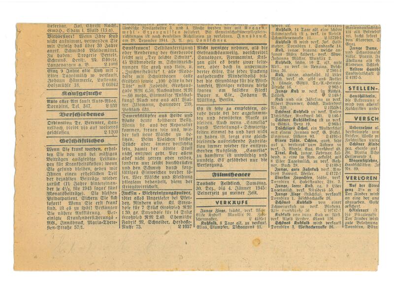Zwei Artikel und ein Zeitungsausschnitt des Kalenders 1945 des "Tiroler Landbote"