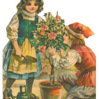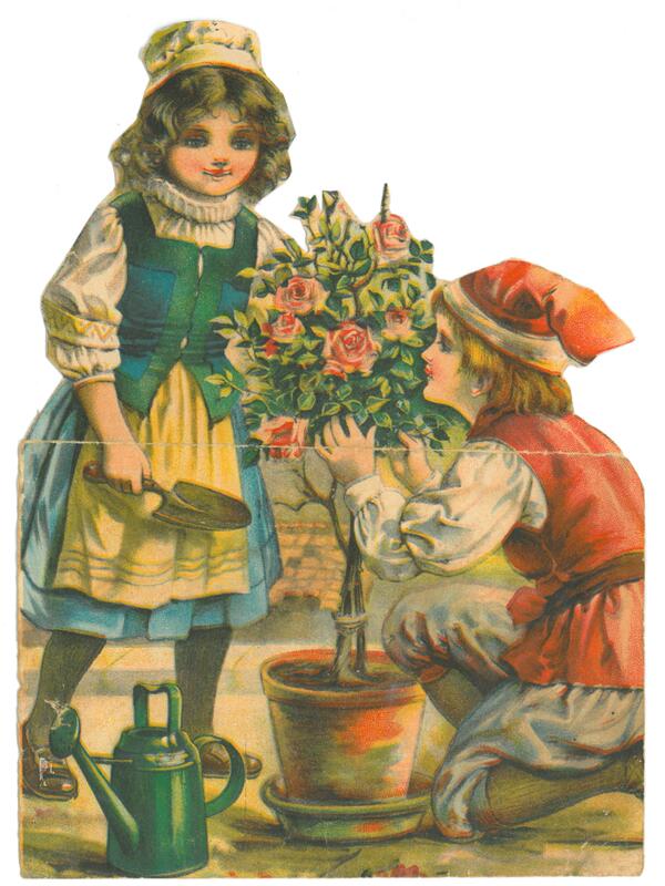Zeitungsausschnitt, der einen Jungen und ein Mädchen zeigt, die ein Rosenbäumchen in einen Topf gepflanzt haben; Es steht eine grüne Gießkanne daneben; das Bild ist den Konturen nach ausgeschnitten, auf der Rückseite befindet sich ein Gedicht über die "geschickte Lilly".