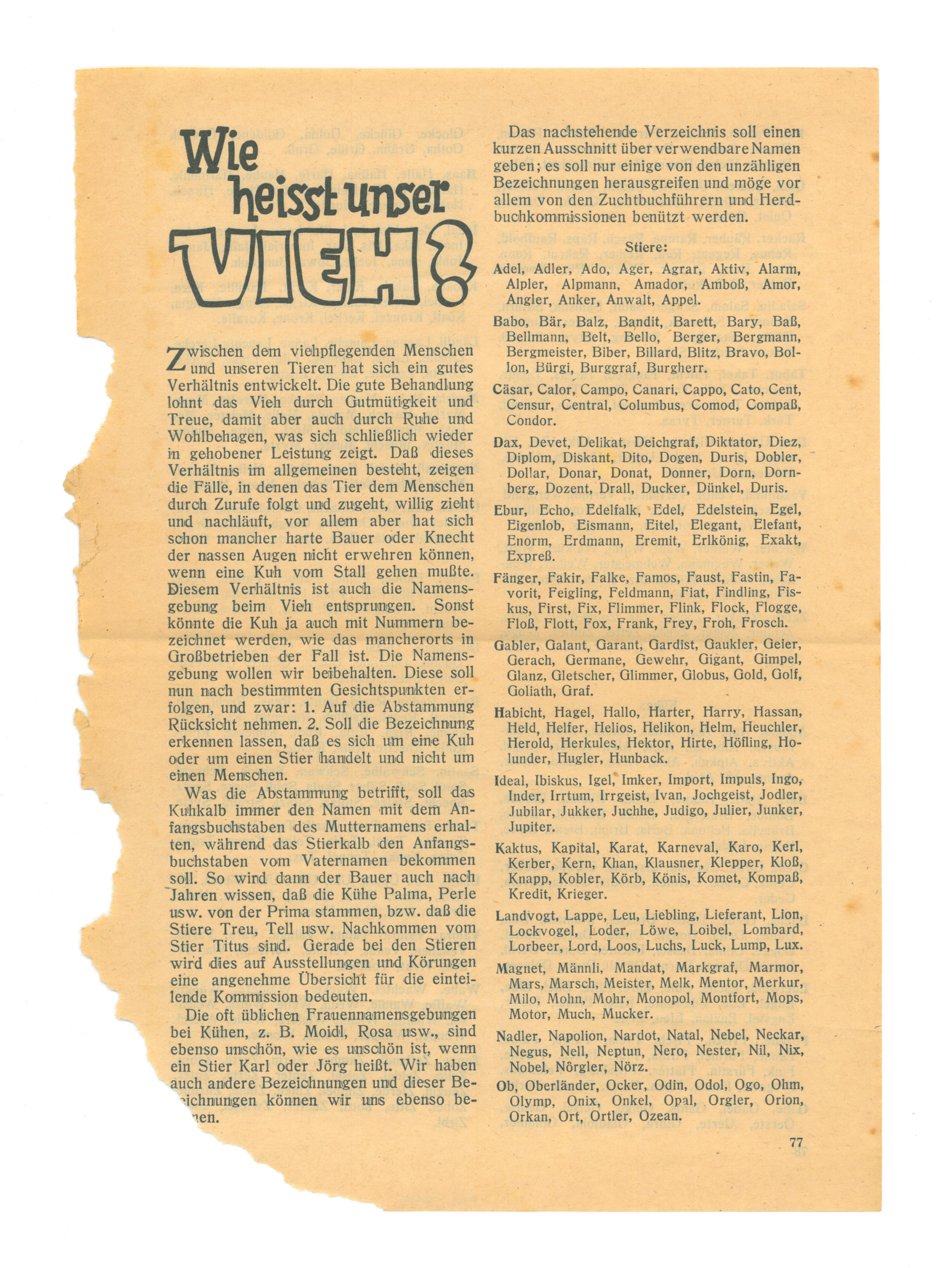 Einzelne Seite aus einer unbekannten Zeitschrift (S. 77/78) mit einer Erklärung, wie man Vieh benennen soll und einem Verzeichnis über mögliche, verwendbare Namen, alphabetisch aufgelistet und unterteilt nach Stiere und Kühe