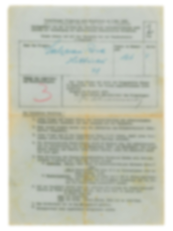 schlecht; Das Informationsblatt sowie die Anmeldung haben etliche Stockflecken und das Papier ist leicht brüchig. Die Anmeldung selber hat ein leicht bläuchlich gefärbtes Papier, das des Informationsblattes ist stark vergilbt.