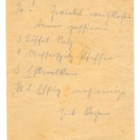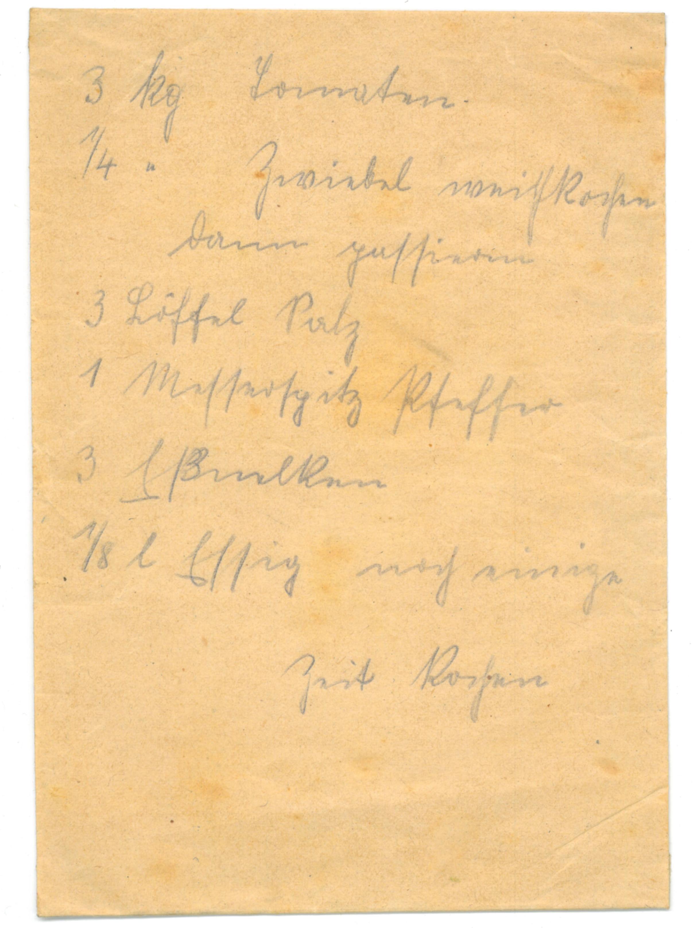 - Das Rezept für Tomatensoße (Ann.) ist mit Bleistift auf einen Papiersack geschrieben