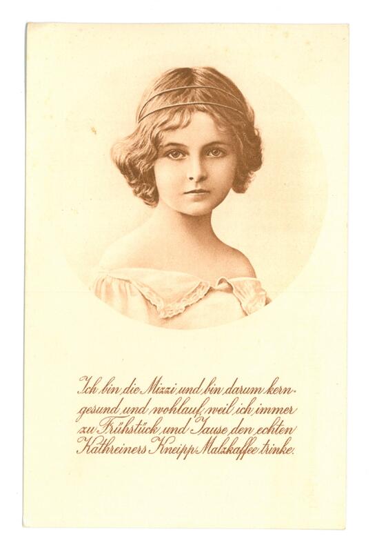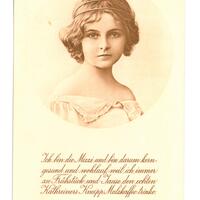 Postkarte; auf der Vorderseite ist eine junge Frau abgebildet, unter dem Text geschrieben steht; auf der Rückseite sind Linien, die die Karte als Ansichtskarte markieren
