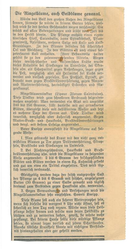 - Der Zeitungsausschnitt lobt die Ringelblume, beschreibt ihren Gebrauch und die Herstellung einer Ringelblumentinktur