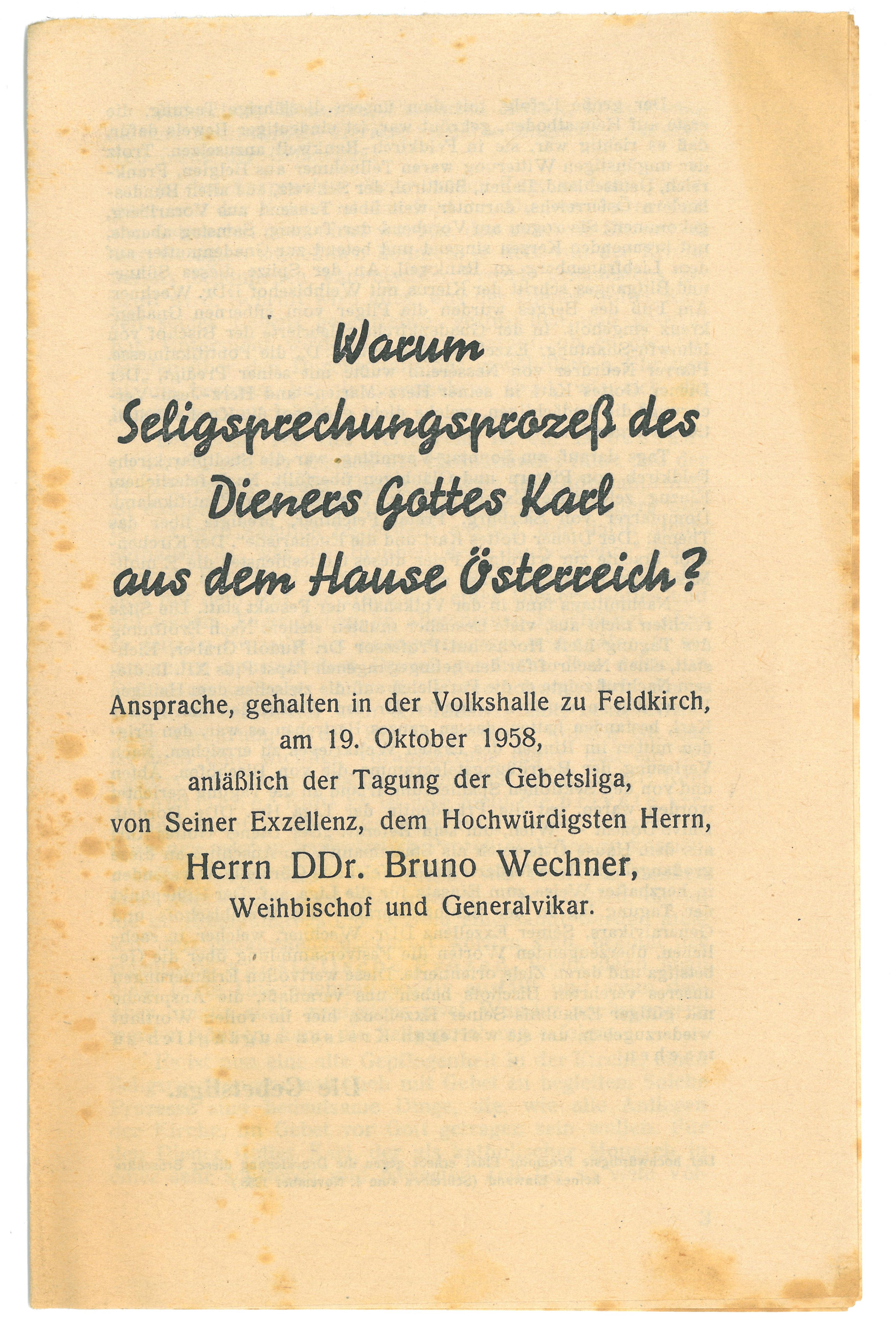 Ansprache; gehalten in der Volksschule zu Feldkirch am 19. Oktober 1958; anlässlich der Tagung der Gebetsliga