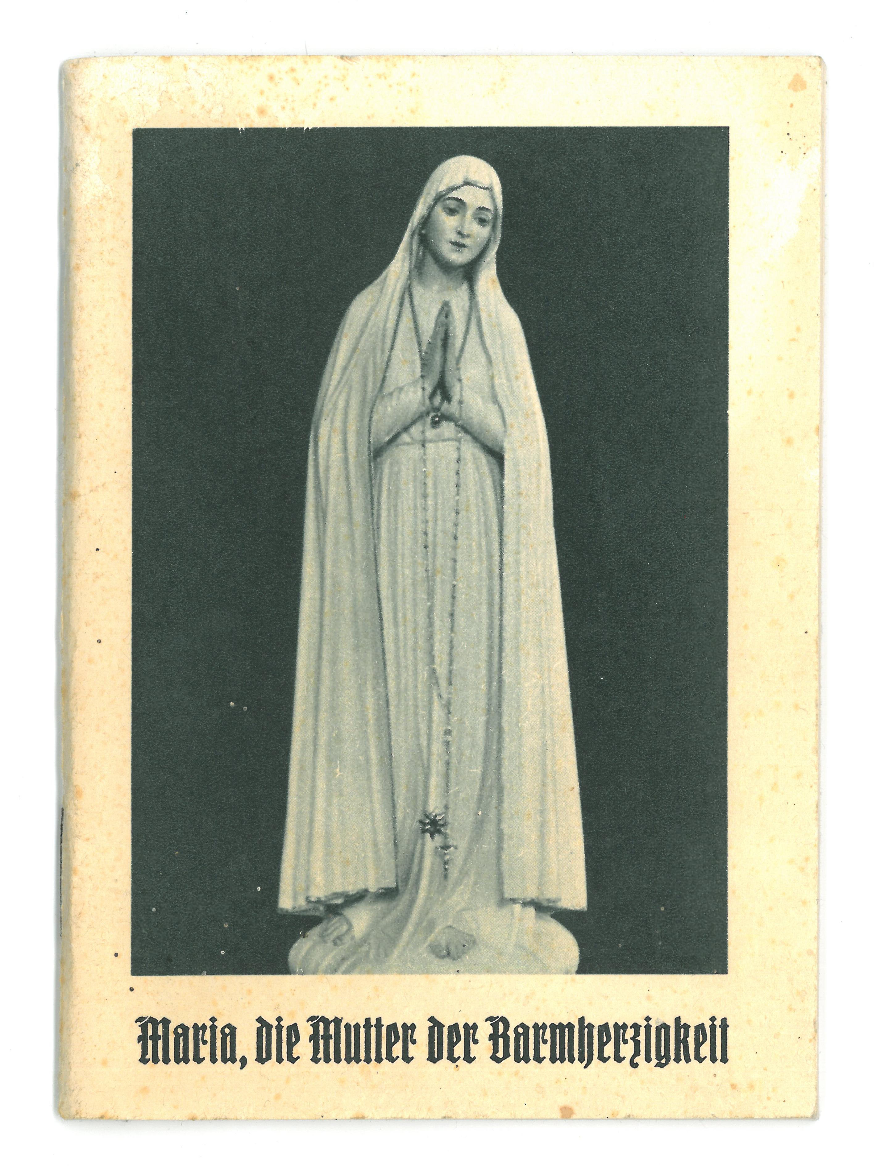 Maria, die Mutter der Barmherzigkeit; im Heft liegt eine kleine Karte mit einem Marienbild; hinten ist ein Gebet und ein Versprechen aufgedruckt; das Heft selbst weist auf den ersten drei Seiten nach dem Titelblatt einen Produktionsfehler auf