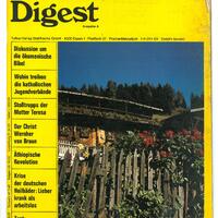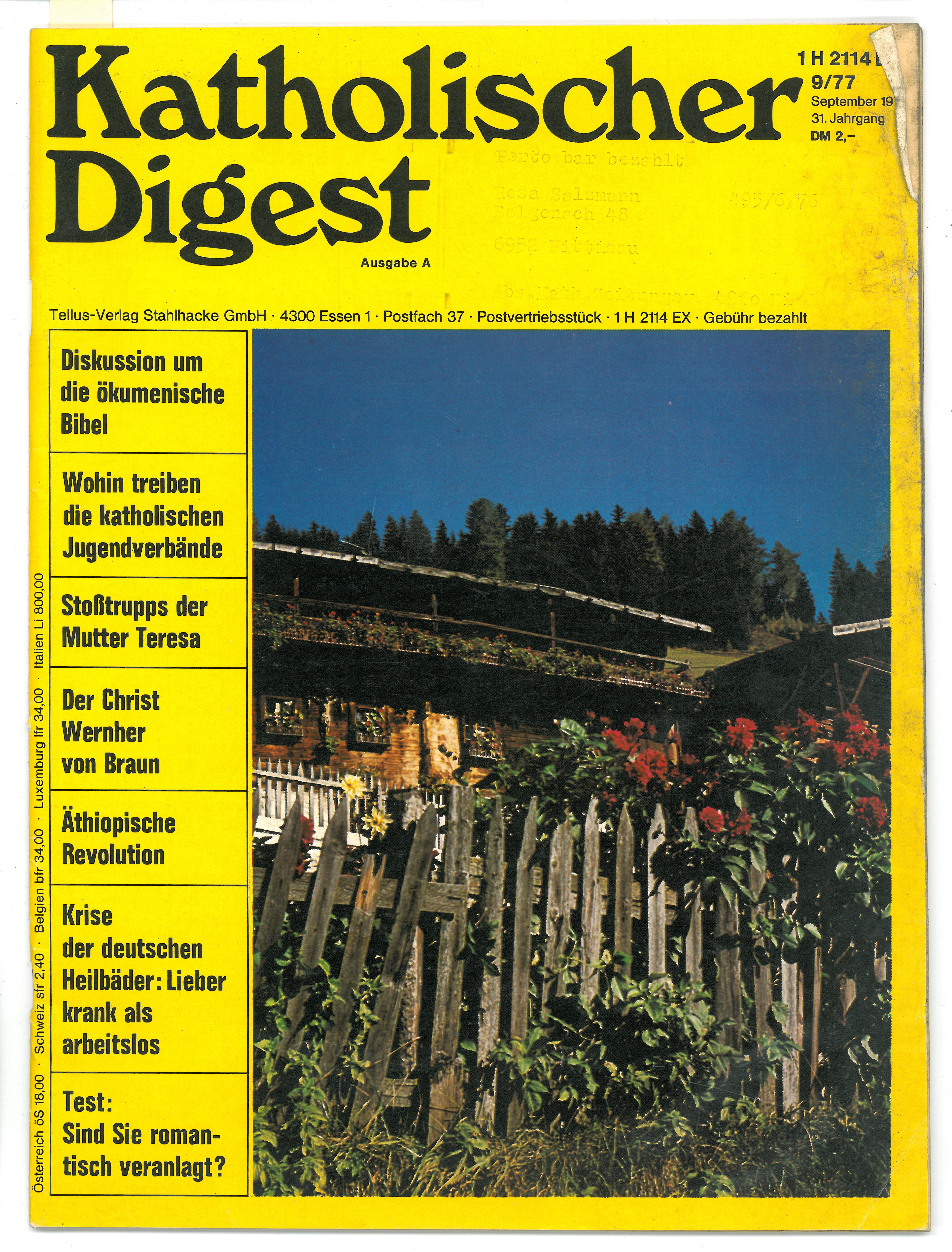 Katholischer Digest; 31. Jahrgang; Ausgabe A 9/77; Vierfarbiger Umschlag; Auf der Rückseite mit AEG Küchenherd-Werbung und Autowerbung; Seite 41: Die Einmachwelle rollt; Seite 45: Was die Frau im Haushalt braucht; Seite 47: Unser Test: Sind sie romantisch veranlagt; Seite 48: Ausgefülltes Kreuzworträtzel; Seite 49: Witze
