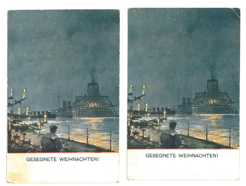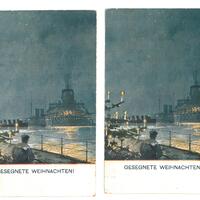 - beide Postkarten mit demselben Motiv; ein Stück Christbaum im Vordergrund; ein Schiff im Hintergrund; gemalt