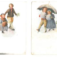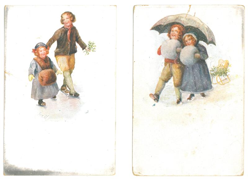 02: Postkarte gemalt mit zwei Kindern in Schlittschuhen; unbeschrieben - Umfang