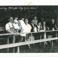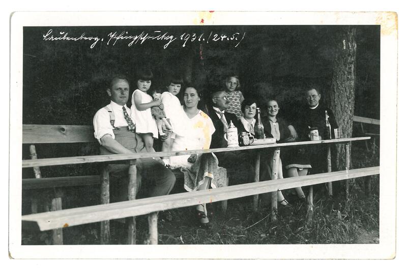 - Postkarte Schwarzweißfotografie Familie mit Pfarrer zu Tisch im Freien