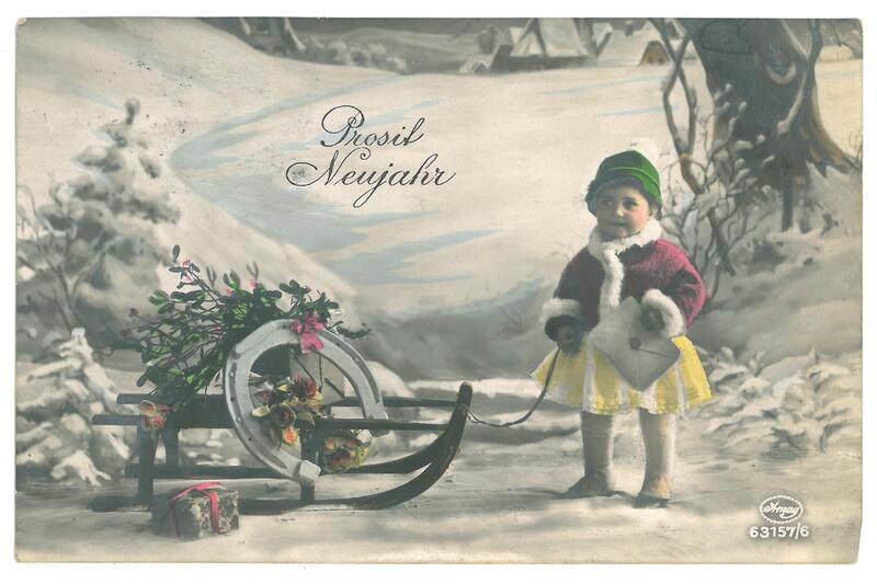 Postkarte mit Kind und Rodel im Schnee; gemalt