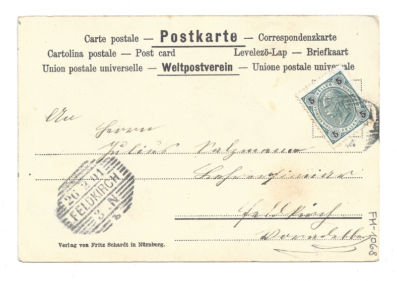 - 5-Heller-Briefmarke. Die Tinte ist auf der Bildseite stellenweise verschwommen.