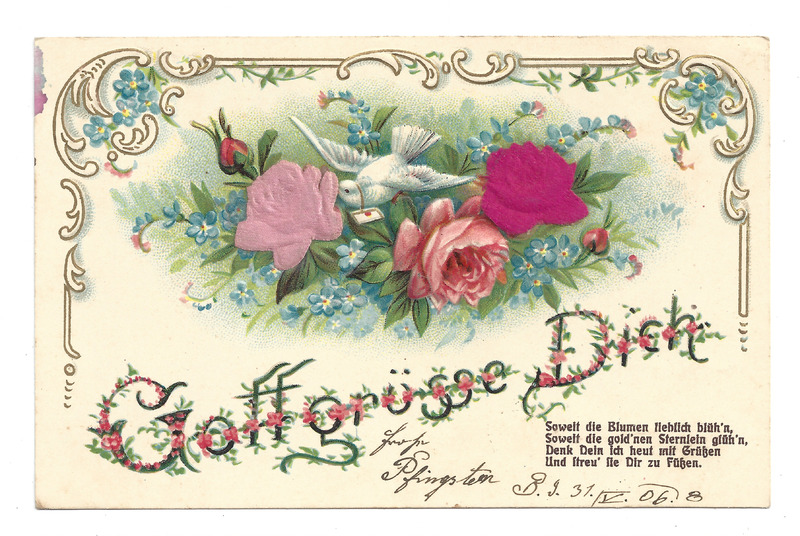 - Brieftaube, Vergissmeinnicht, Rosen in Satin
