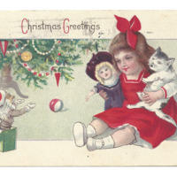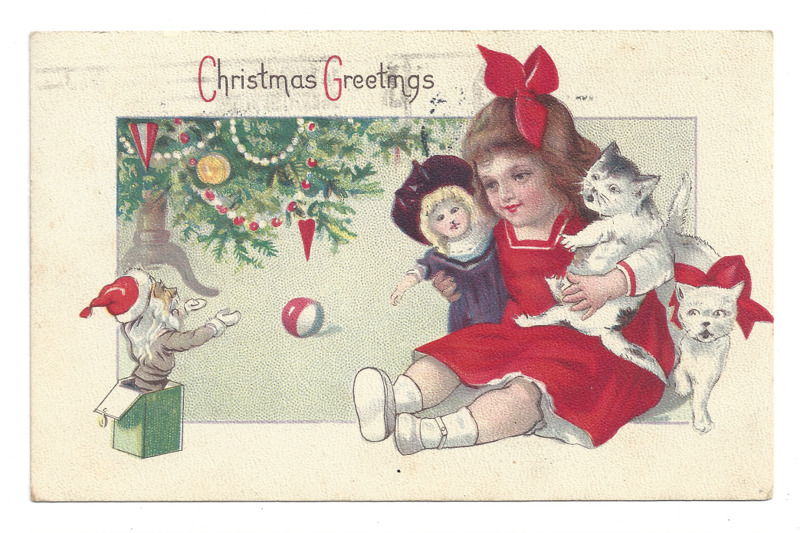 - Mädchen mit Puppe und zwei Katzen; Weichnachtsmann aus der Springbox; Weihnachtsbaum im Hintergrund.