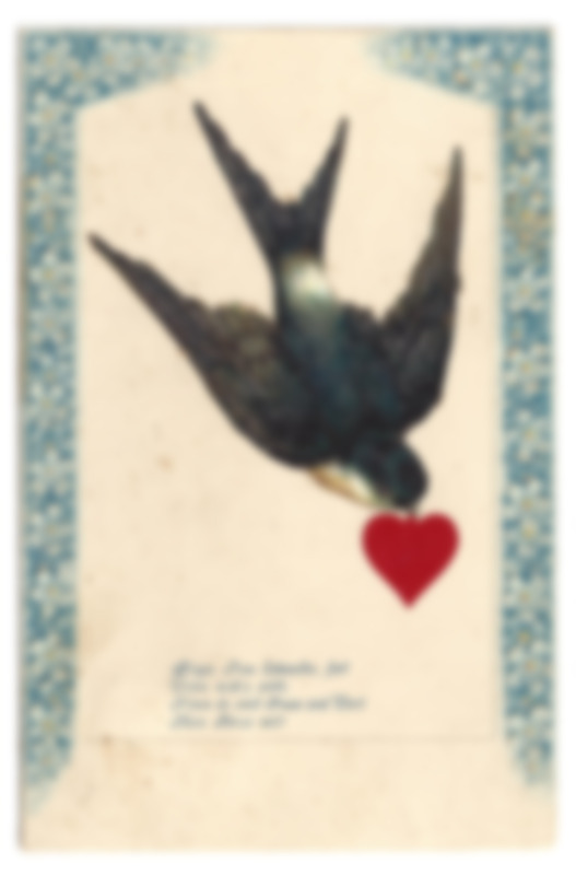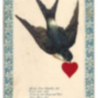 farbige Postkarte. Mit aufgeklebten Lackbildern, einer Schwalbe mit einem rotem Herz im Schnabel und einem Rahmen mit Blumenmotiv im Prägedruck.