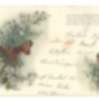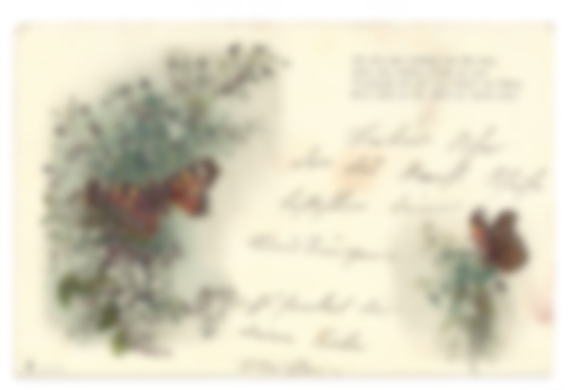 Farbige Postkarte mit Schmetterlingen und Blumen; Auf den Schmetterlingen ist eine raue, goldglitzernde Schicht aufgedruckt.