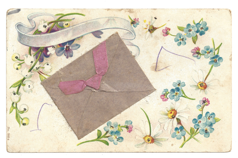 Vorderseite mit blauen Blumen und aufgeklebtem kleinen Umschlag mit rosa Schleife - Räumlicher Geltungsbereich