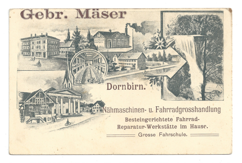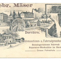 Postkarte; schwarz-weiß Collage mit Ansichten von Dornbirn; betitelt mit "Gebr. Mäser" (links oben); "Dornbirn. Nähmaschinen- u. Fahrradgrosshandlung Besteingerichtete Fahrradreparatur-Werkstätte im Hause. Grosse Fahrschule." (rechts unten); nicht abgestempelt