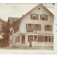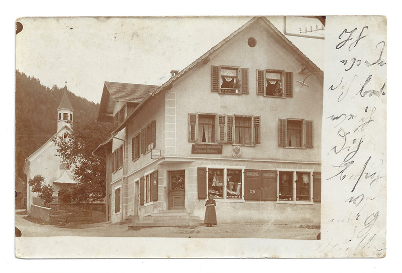 Auf der Postkarte ist die "Gemischte Waarenhandlg. von Katharina Meßmer" abgebildet. Daneben ist etwas geschrieben, das jedoch sehr unleserlich ist, da das Fotopapier wasserabweisend ist.