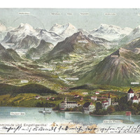 Postkarte Bergpanorama am Thuner See, gemalt;