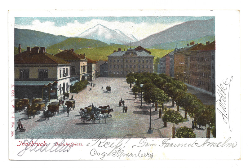 - Poststempel unleserlich. Abgebildet ist der Bahnhofplatz Innsbruck (vermutlich Westbahnhof); im Hintergrund sind Berge gezeichnet, von denen einer die Serles sein könnte.