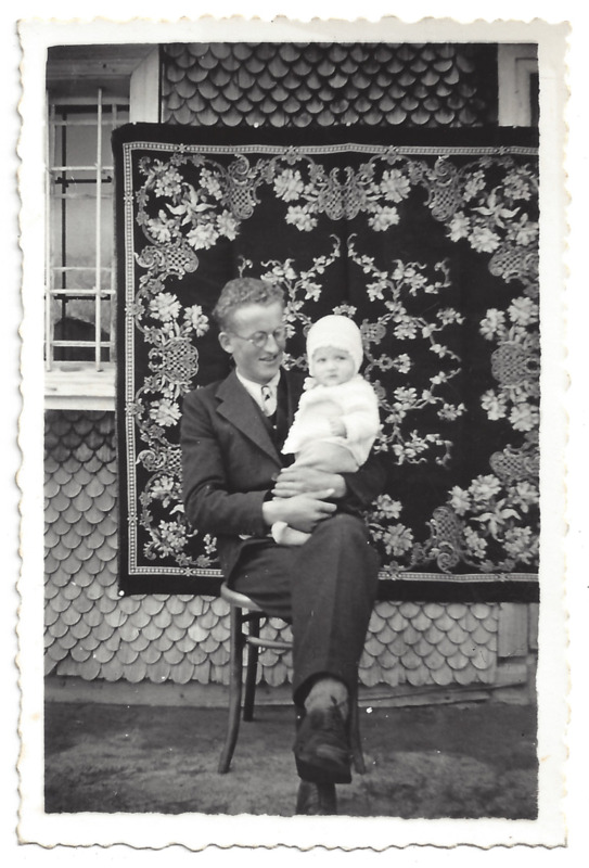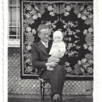 Bild eines sitzenden Mannes mit Baby vor einem Haus; bestickte Decke als Hintergrund am Haus angebracht